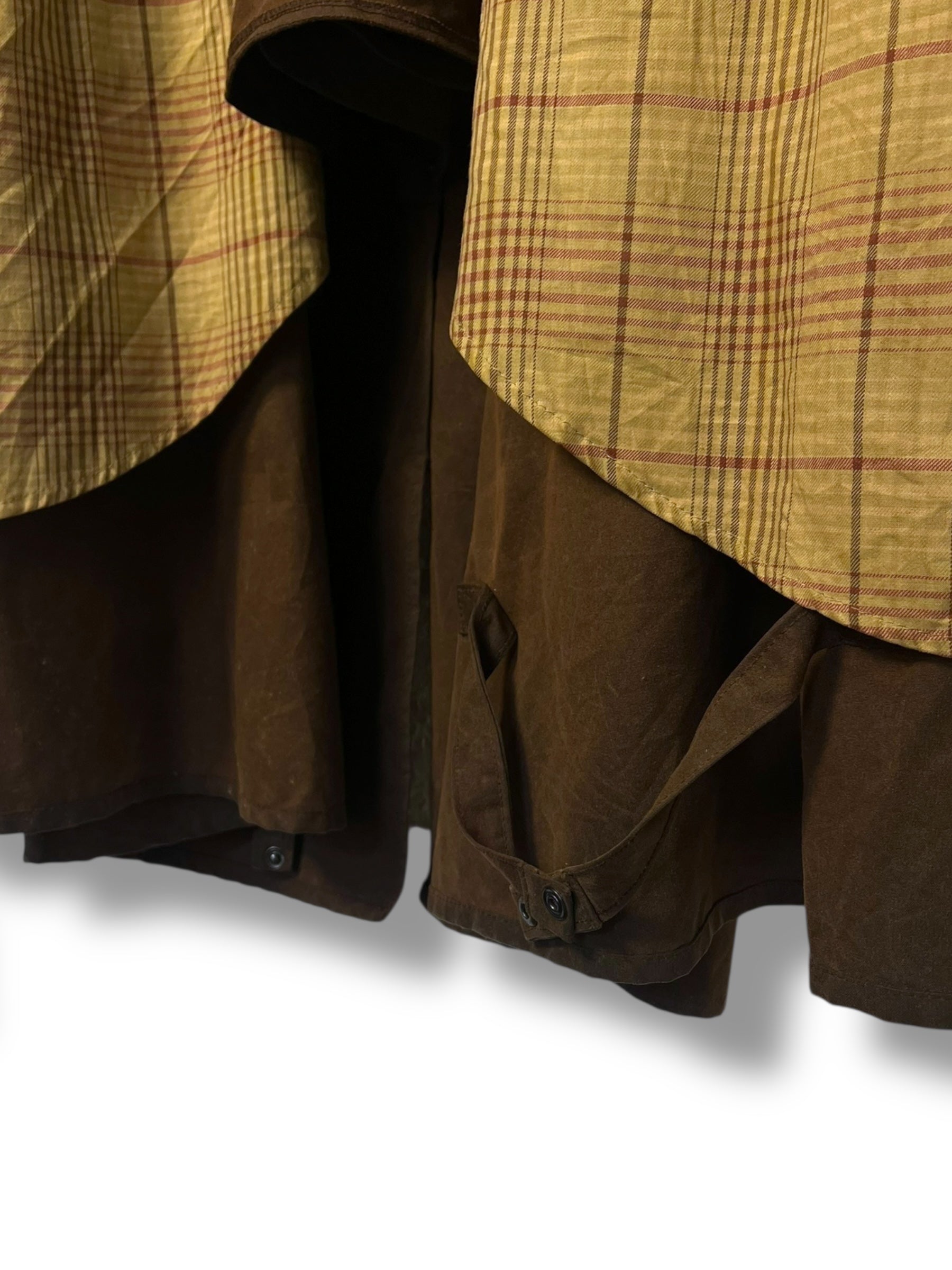 Excellent vintage condition – an outstanding Barbour Stockman Coat in brown waxed cotton, size XXL, dating back to the early 2000s. Originally designed for stockmen and outdoor workers, this model embodies the purest spirit of Barbour: durability, weather protection, and timeless British heritage.