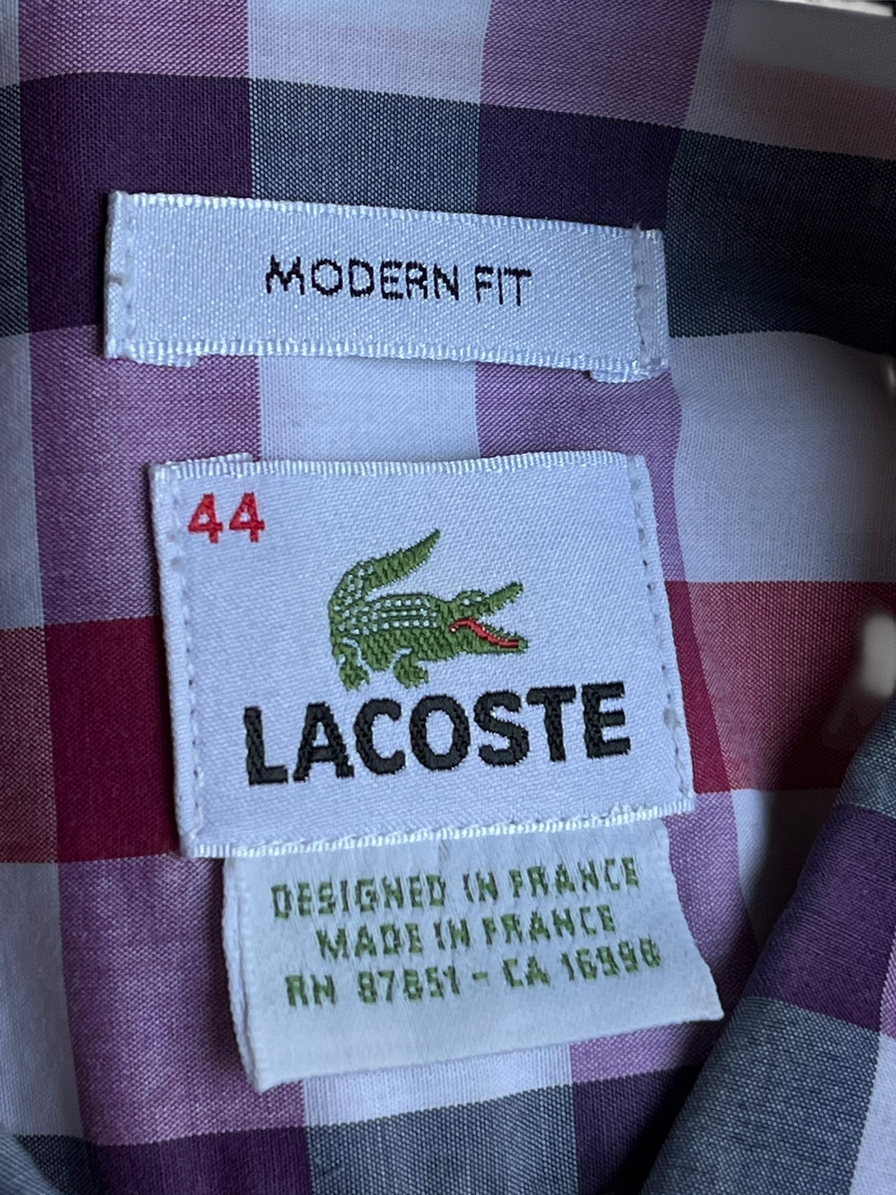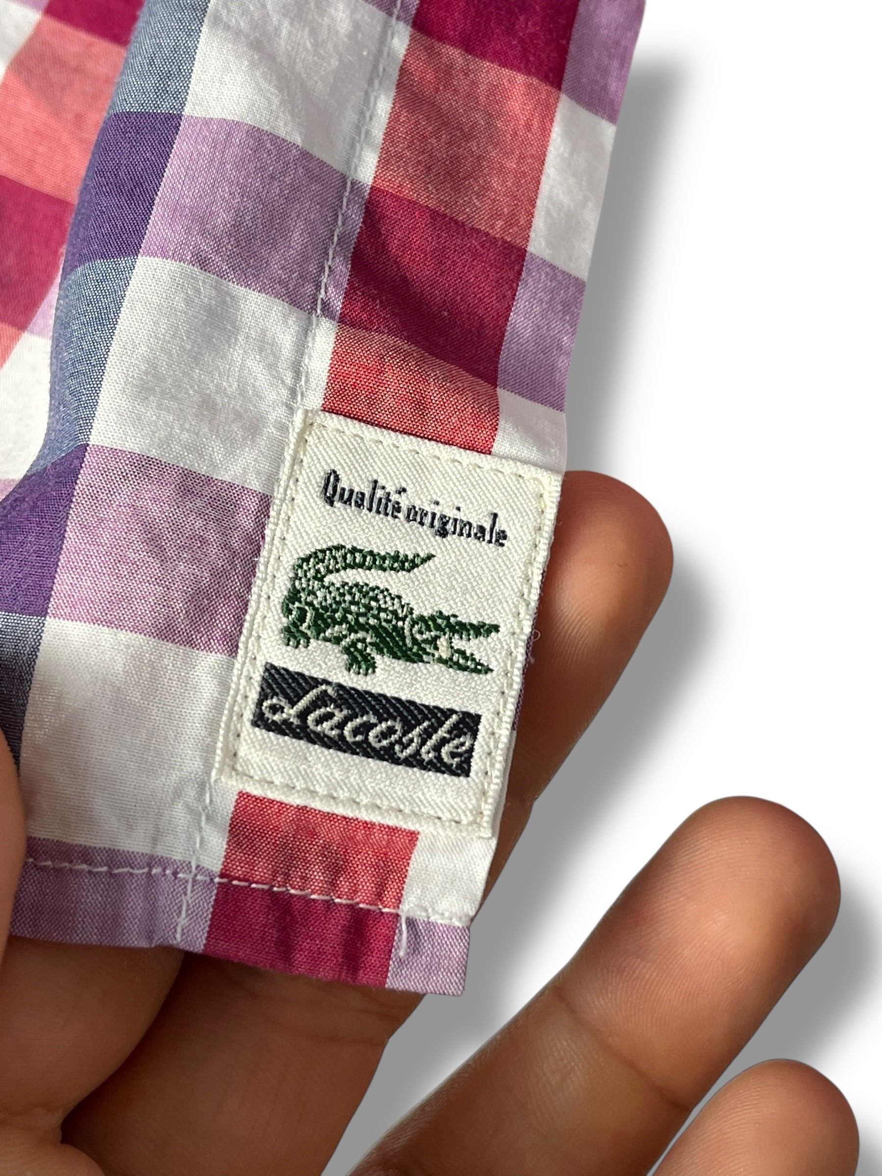 Good vintage condition – washed, fresh, and ready to wear. Lightweight cotton shirt in red, navy, and white check pattern. Button-down collar, chest pocket with embroidered Lacoste crocodile logo. Modern Fit.