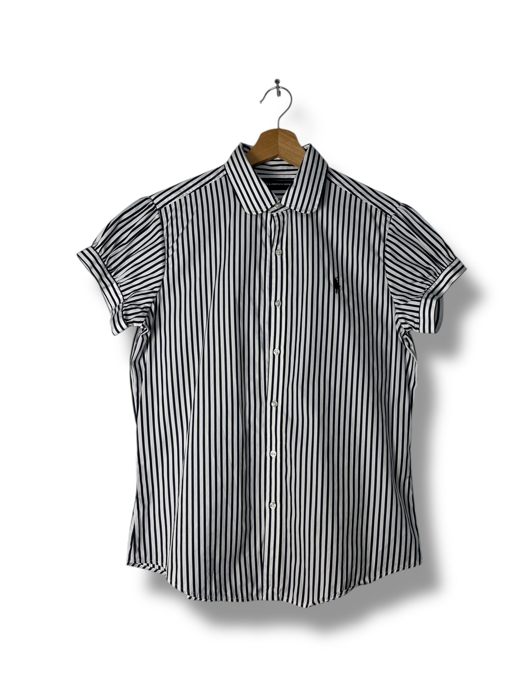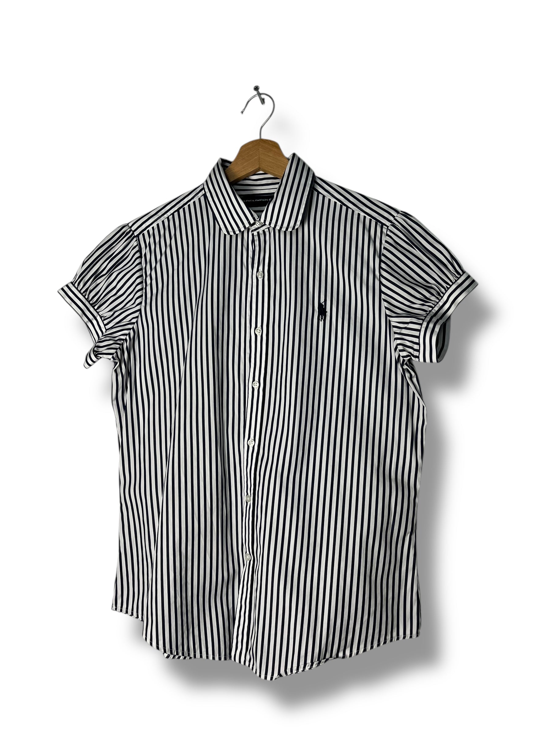 Elegant Ralph Lauren short-sleeve shirt for women, featuring black and white vertical stripes and the signature pony logo embroidered on the chest. With its clean cut and slightly open short sleeves, this piece offers both comfort and style – a refined yet casual shirt, perfect for everyday wear.