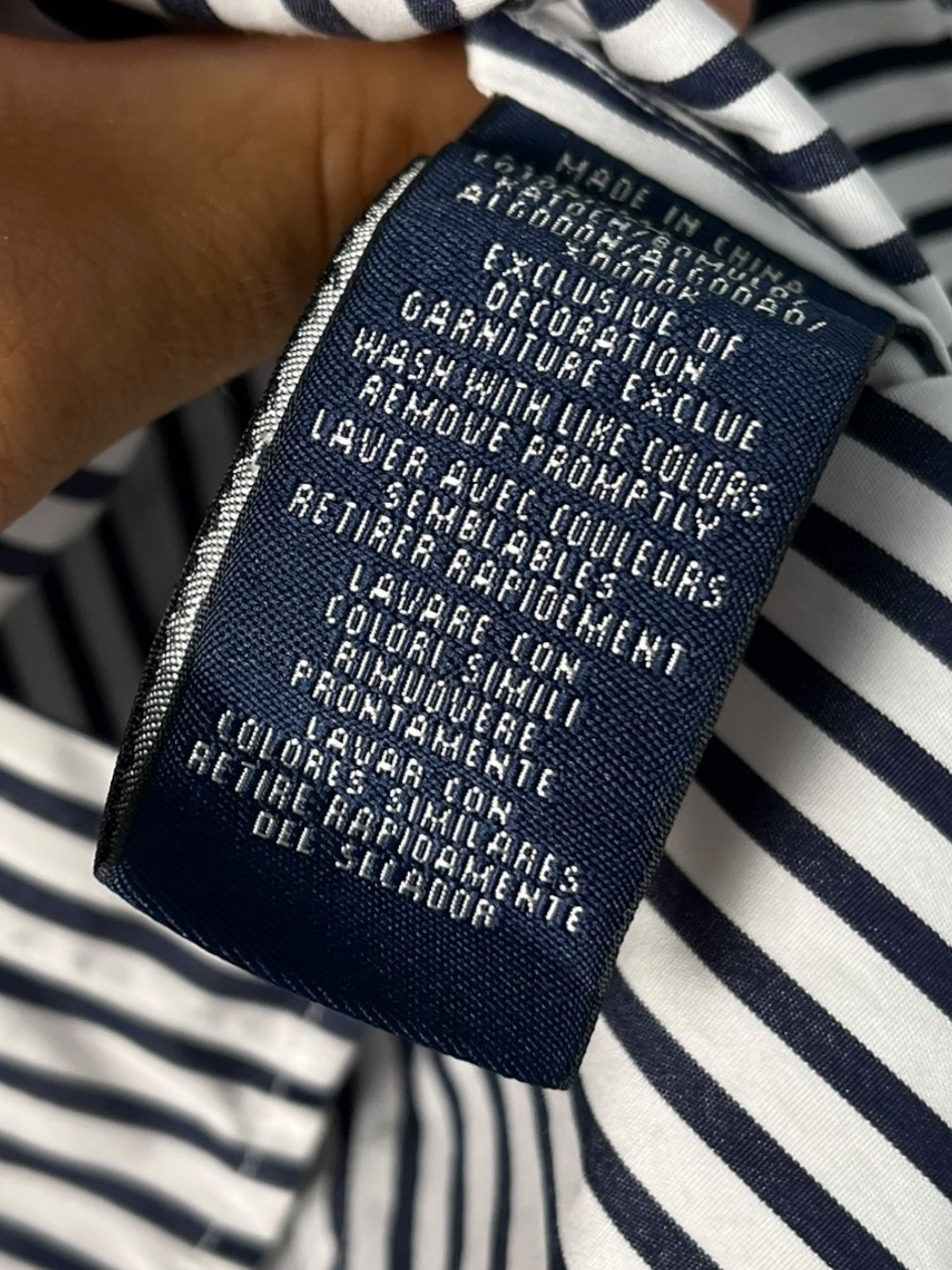 Keywords: Ralph Lauren Sport shirt, women’s vintage shirt, striped blouse, pre-owned Ralph Lauren, black white stripes, pony logo