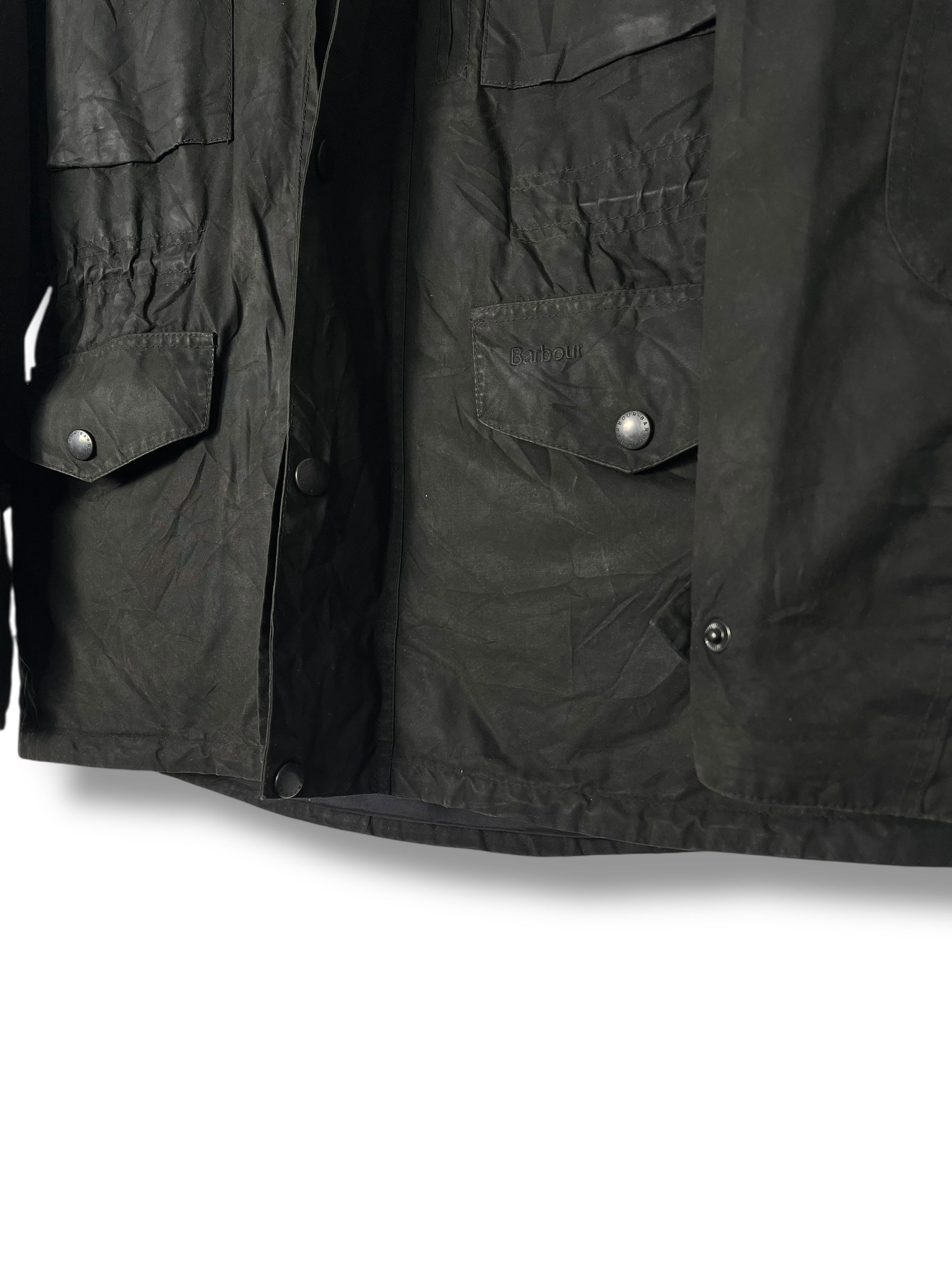 Very good vintage condition. One of the most versatile Barbour models, compact yet warm, ideal for everyday wear. Features a waist drawstring for a tailored fit and a hidden hood that can be zipped out when needed. Quilted lining ensures warmth, while the rugged waxed cotton keeps it durable. Signs of patina consistent with vintage age, no major flaws.