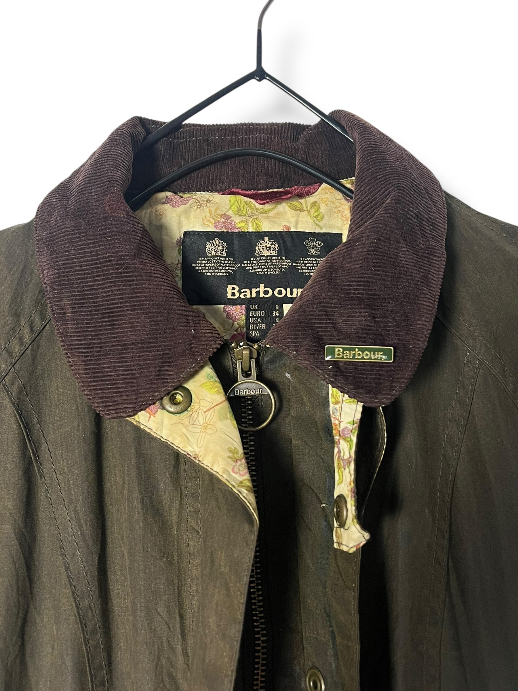 Keywords: Barbour Beadnell, floral lining, vintage Barbour, women’s wax jacket, pre-owned, olive waxed cotton.