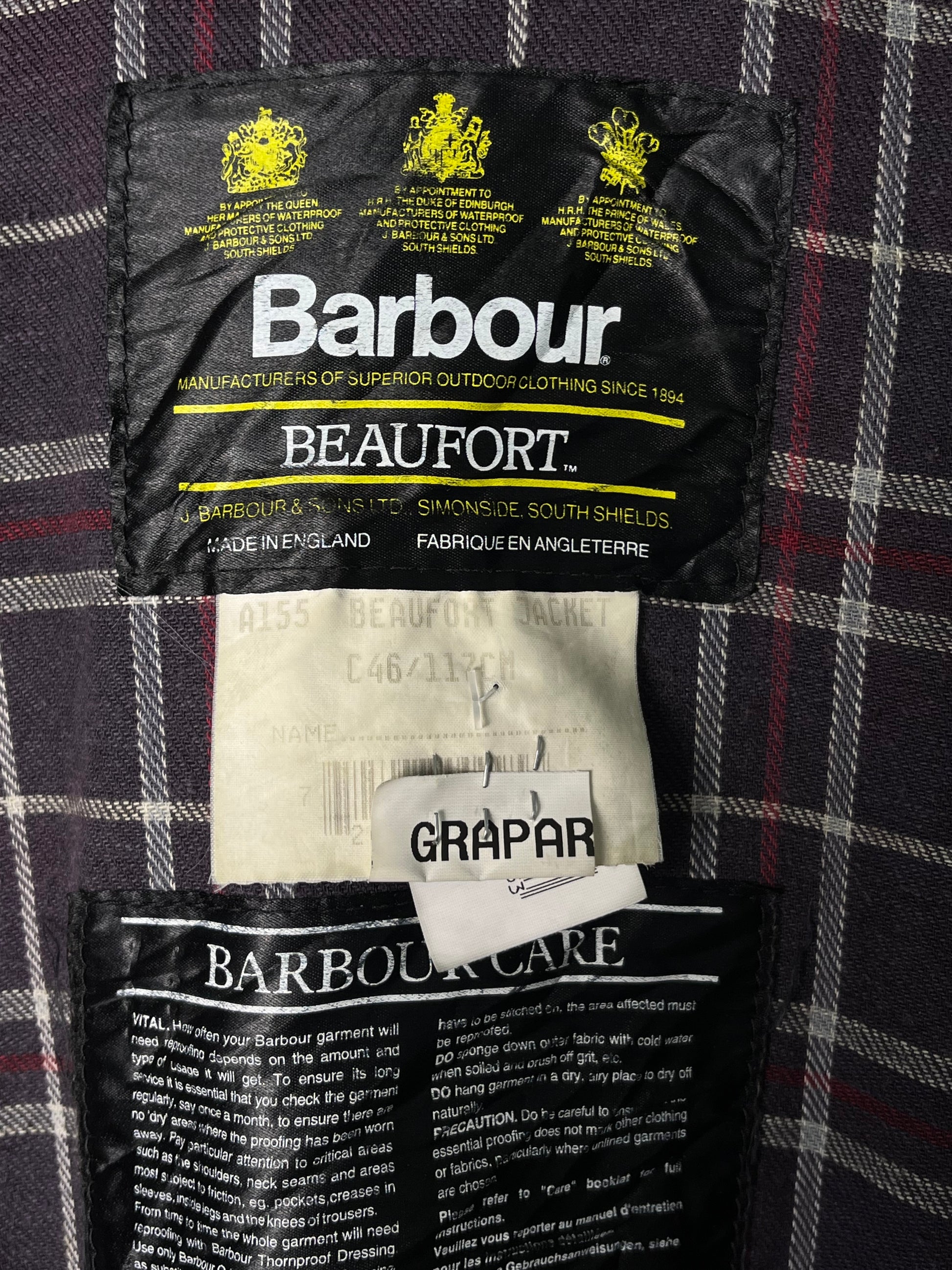 Vintage 1995 Barbour Beaufort in deep navy waxed cotton. Professionally washed and rewaxed, ready to wear. Condition 8/10 — no structural flaws, only natural wrinkles from use and age. Classic corduroy collar, tartan lining, and iconic relaxed Beaufort cut with rear game pocket.