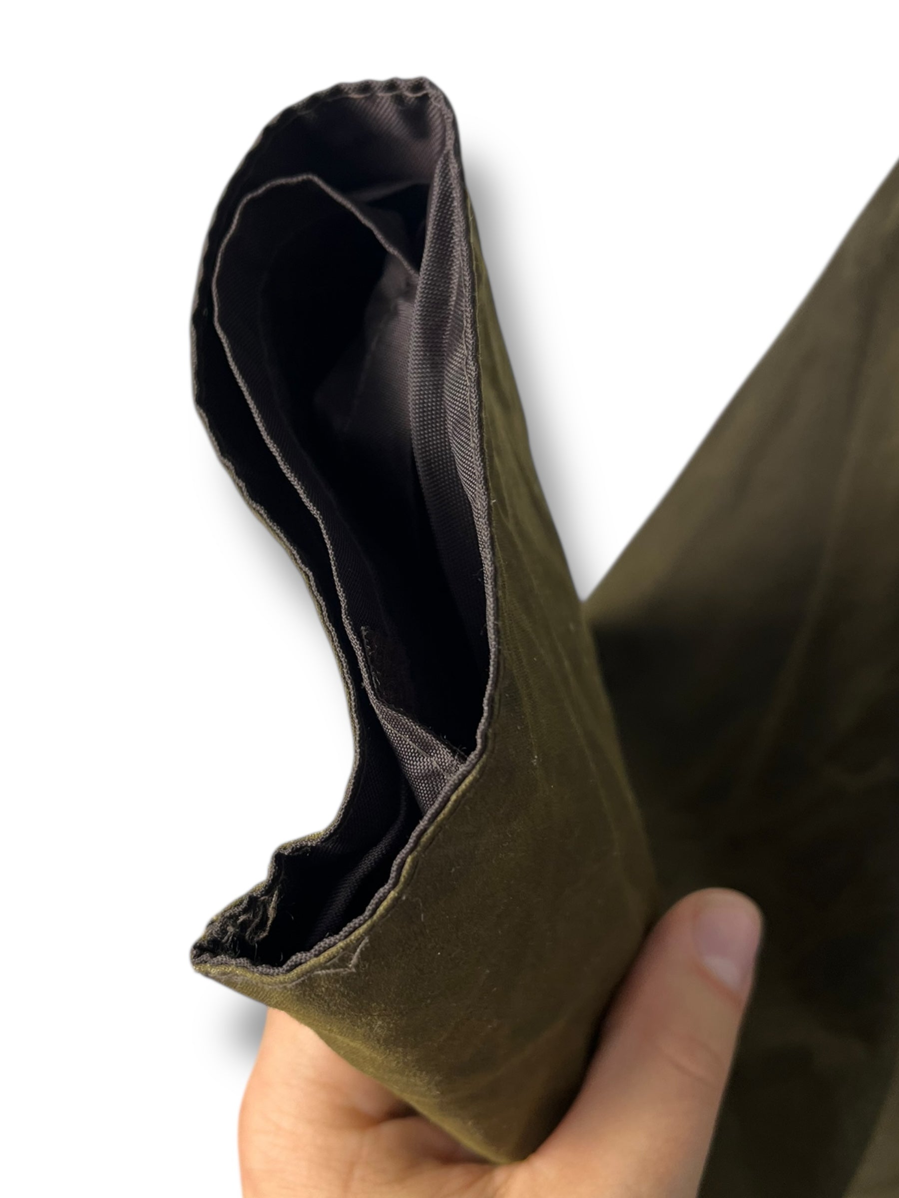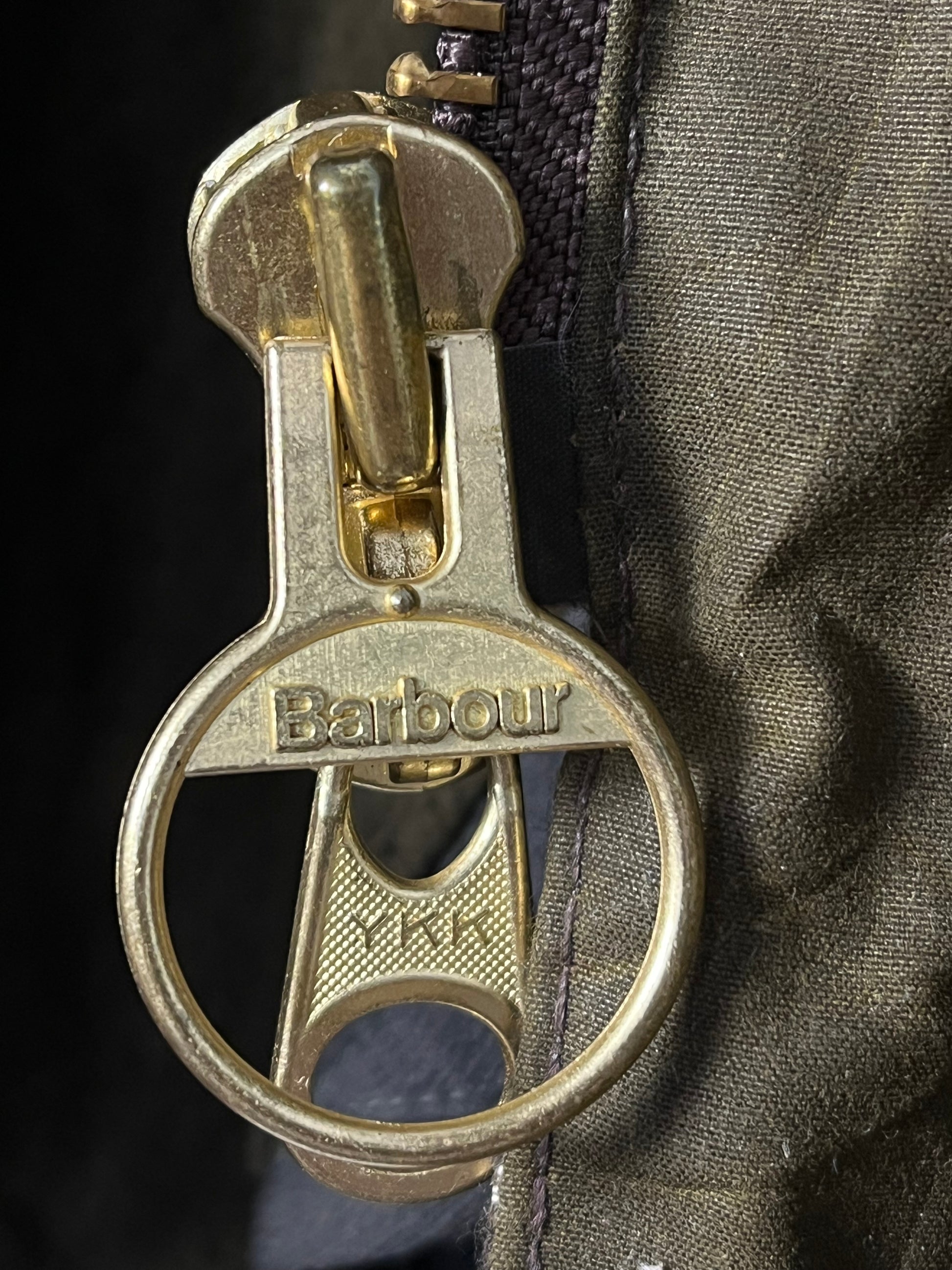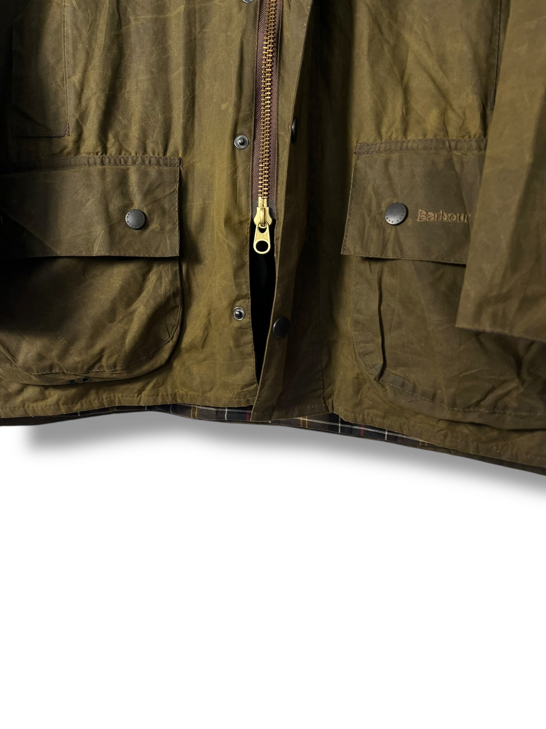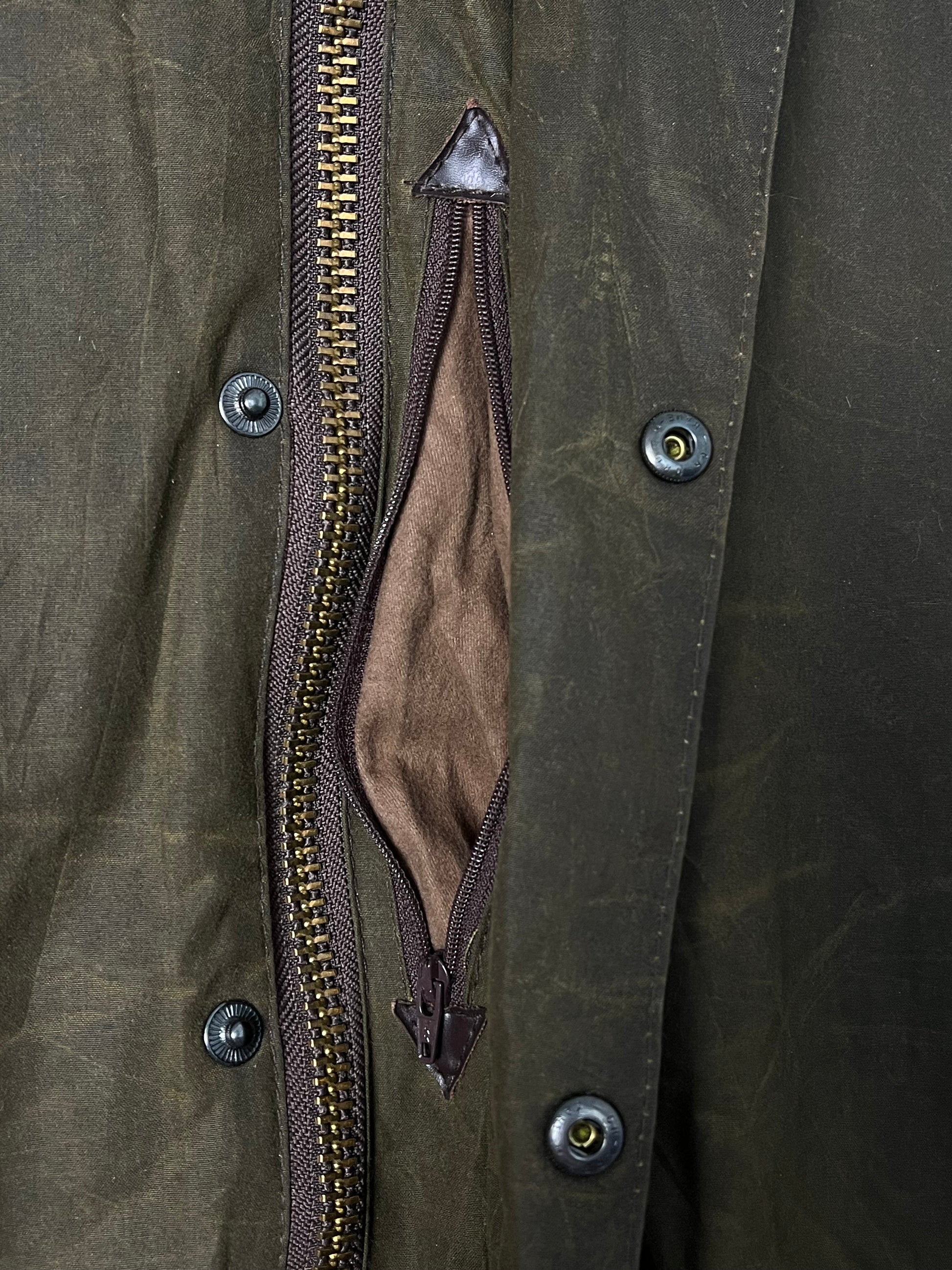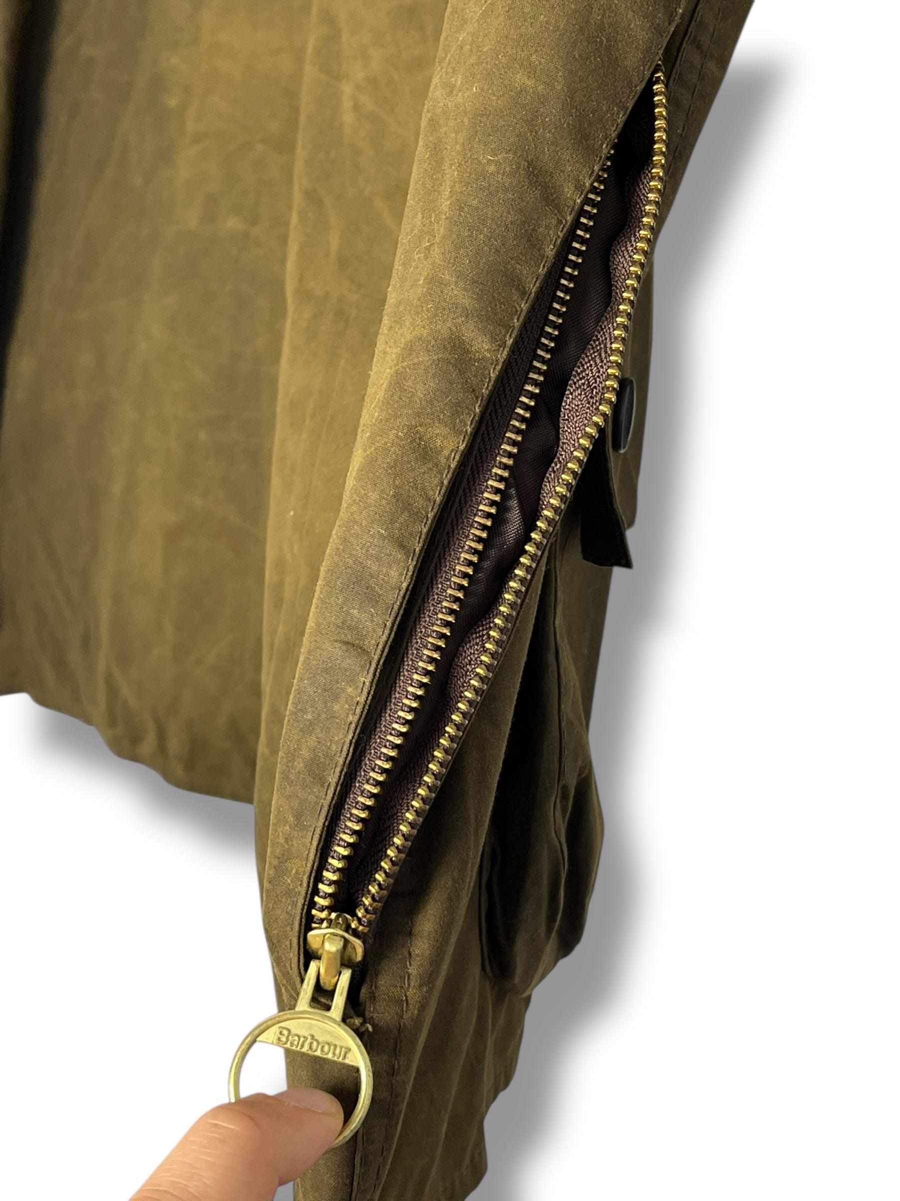 Classic Barbour Beaufort in olive waxed cotton, complete with its original quilted zip-in liner. Features the iconic rear game pocket, corduroy collar and YKK brass two-way zip. Shows light natural fading typical of early 2000s Barbour jackets — no defects, only honest wear that enhances the rugged vintage character. Optional rewaxing available on request.