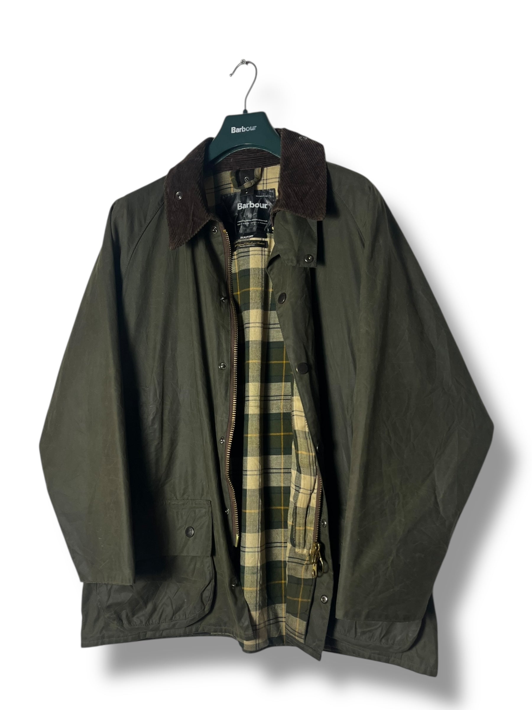 Barbour Beaufort wax jacket from the early 2000s in classic sage green. Size C44, comfortable fit with a slightly longer cut, true to the Beaufort silhouette.