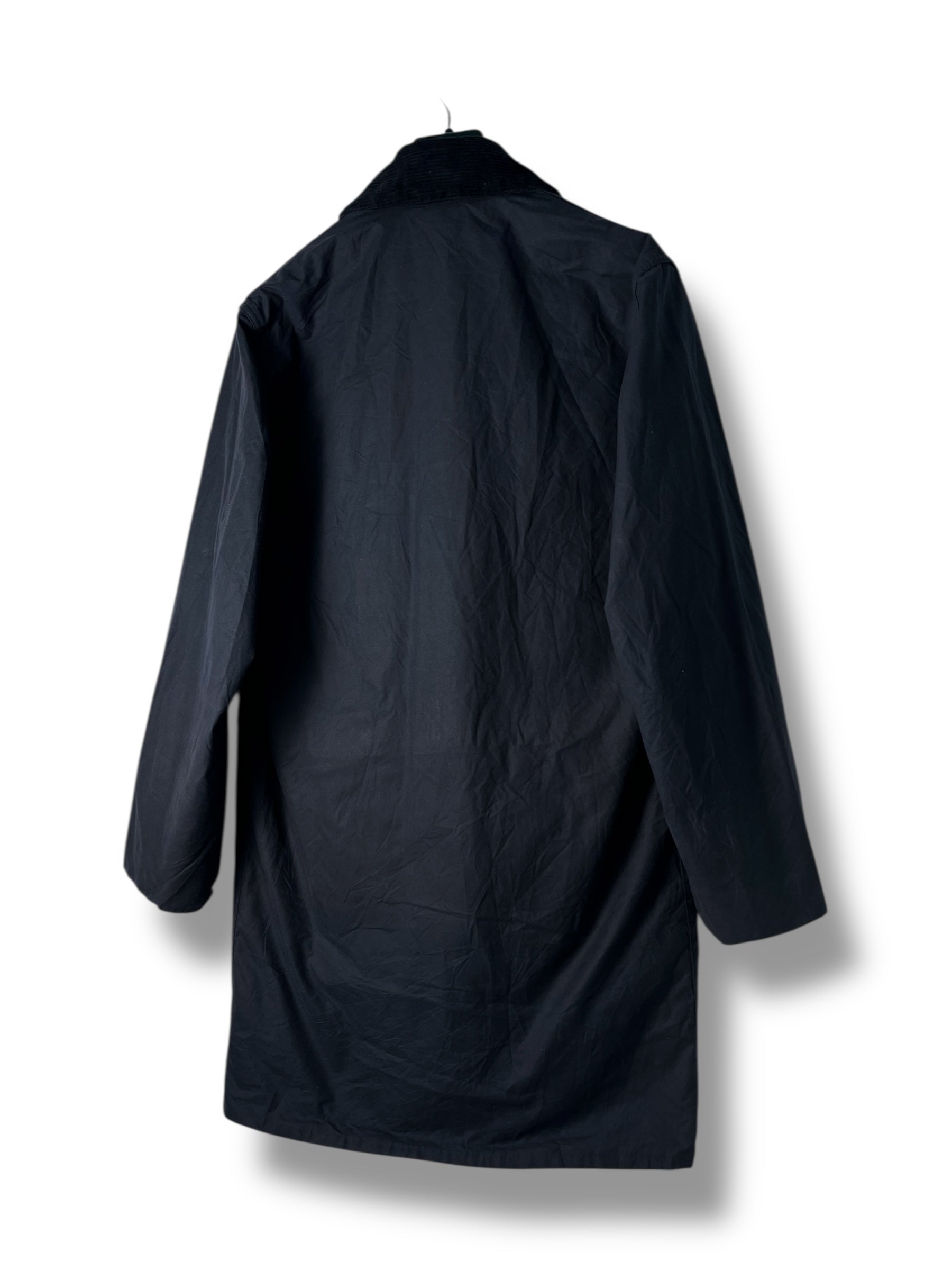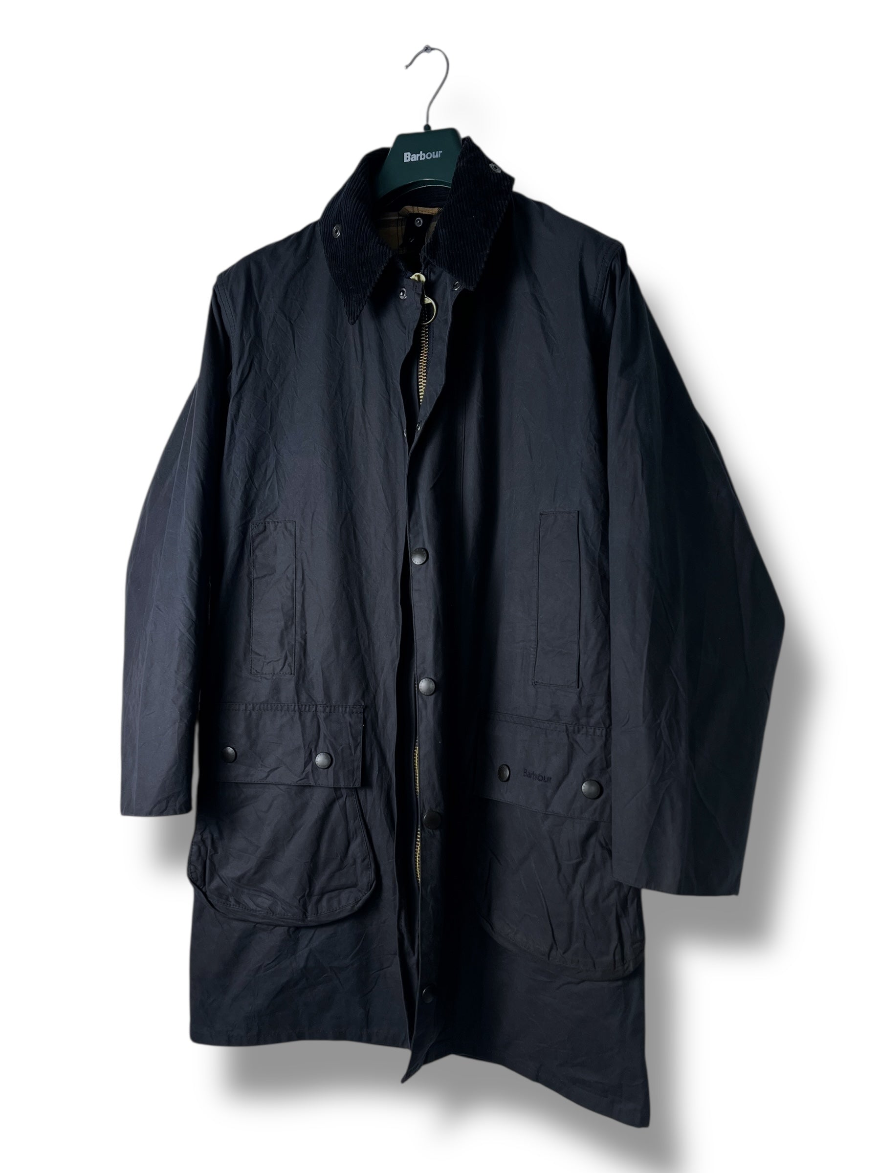 Modern Barbour Border in classic Navy, extra-small size C34, with no flaws and a clean, crisp wax. This is the longer, iconic cut of the Border — functional, timeless, and built for everyday wear.