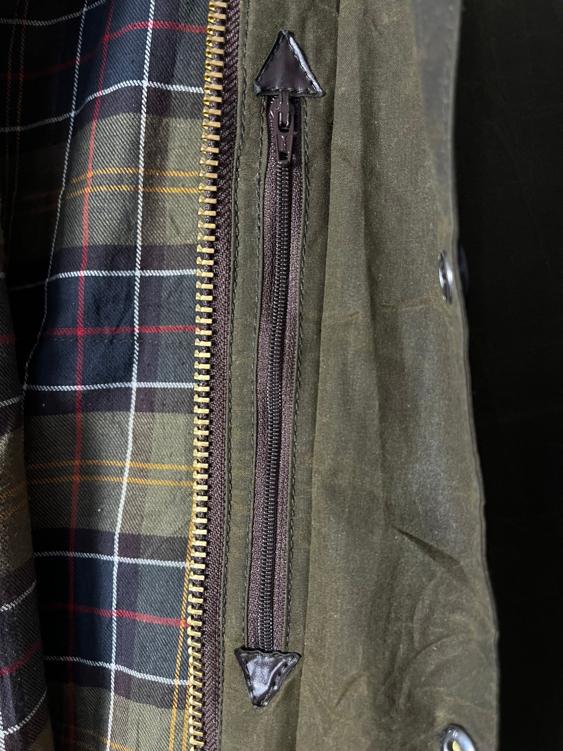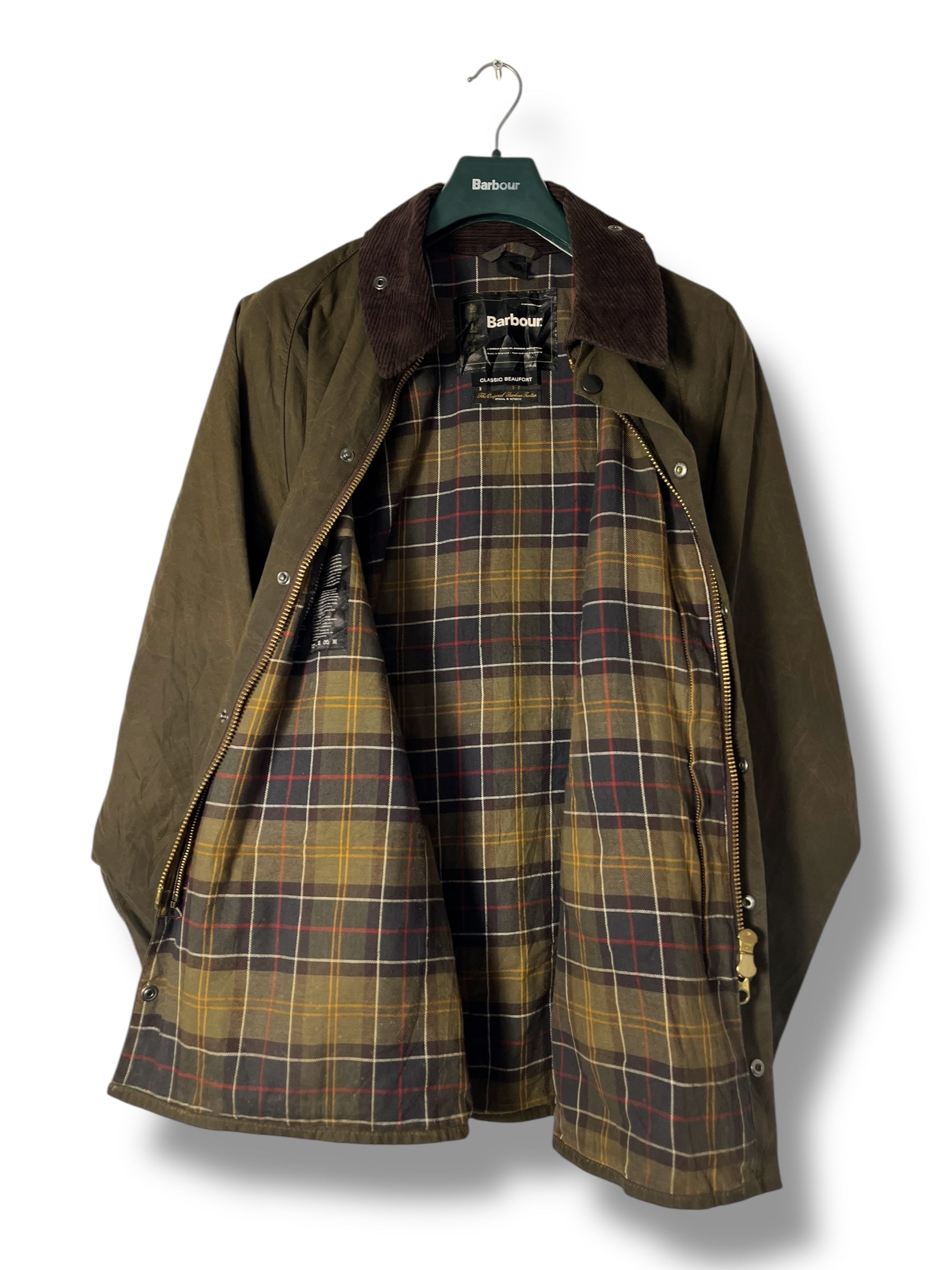 Iconic Barbour Classic Beaufort in olive waxed cotton, modern 2000s version with a slightly longer cut and the timeless country look. Made from 100% waxed cotton, finished with a brown corduroy collar and the classic Barbour tartan lining. Smooth YKK brass zip, rear game pocket, and all original details intact.