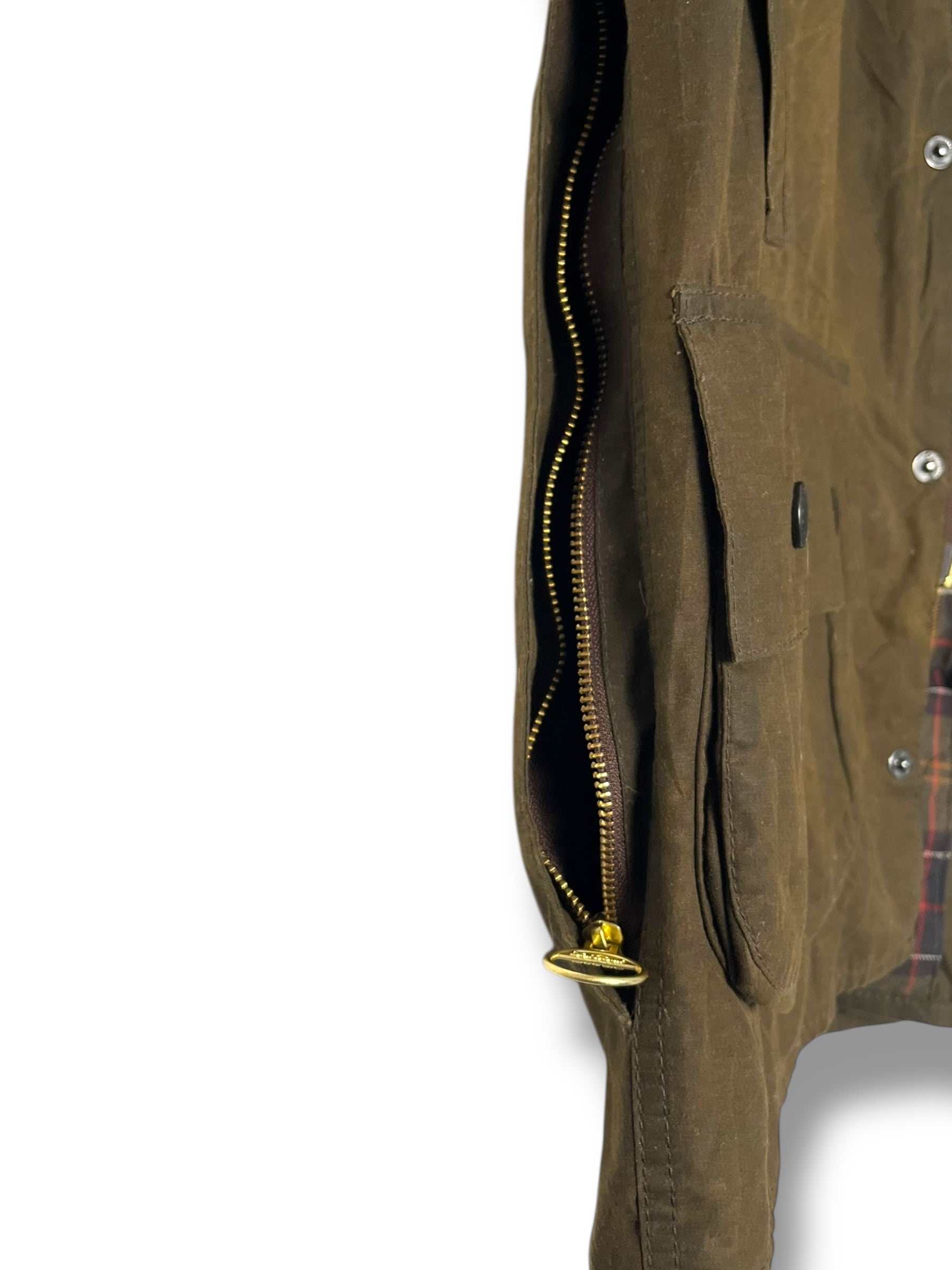 Modern take on the most iconic Barbour jacket ever made. Pre-owned in excellent condition, no flaws, perfectly preserved waxed cotton shell and deep olive tone. Size C38 — one of the most requested fits, equivalent to a Men’s M. Rear game pocket, tartan lining, YKK brass zip and corduroy collar: the full heritage package.