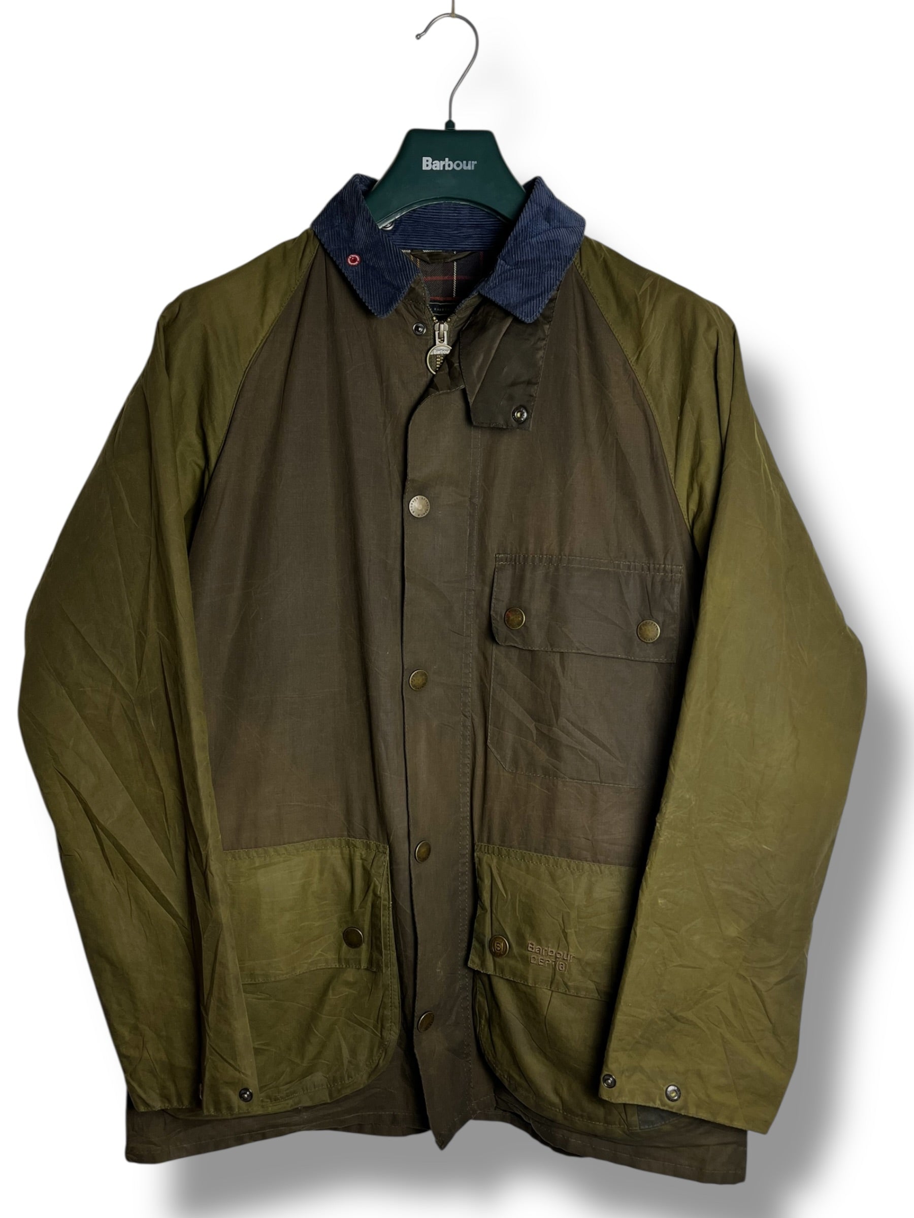 Original Barbour Dept (B) Limited Edition – Customised Bedale. A technical reinterpretation of the classic Bedale featuring a lightweight waxed cotton construction with multiple tones of green, from darker olive panels to lighter yellow-green sections. Designed as a transitional piece, ideal for spring.
