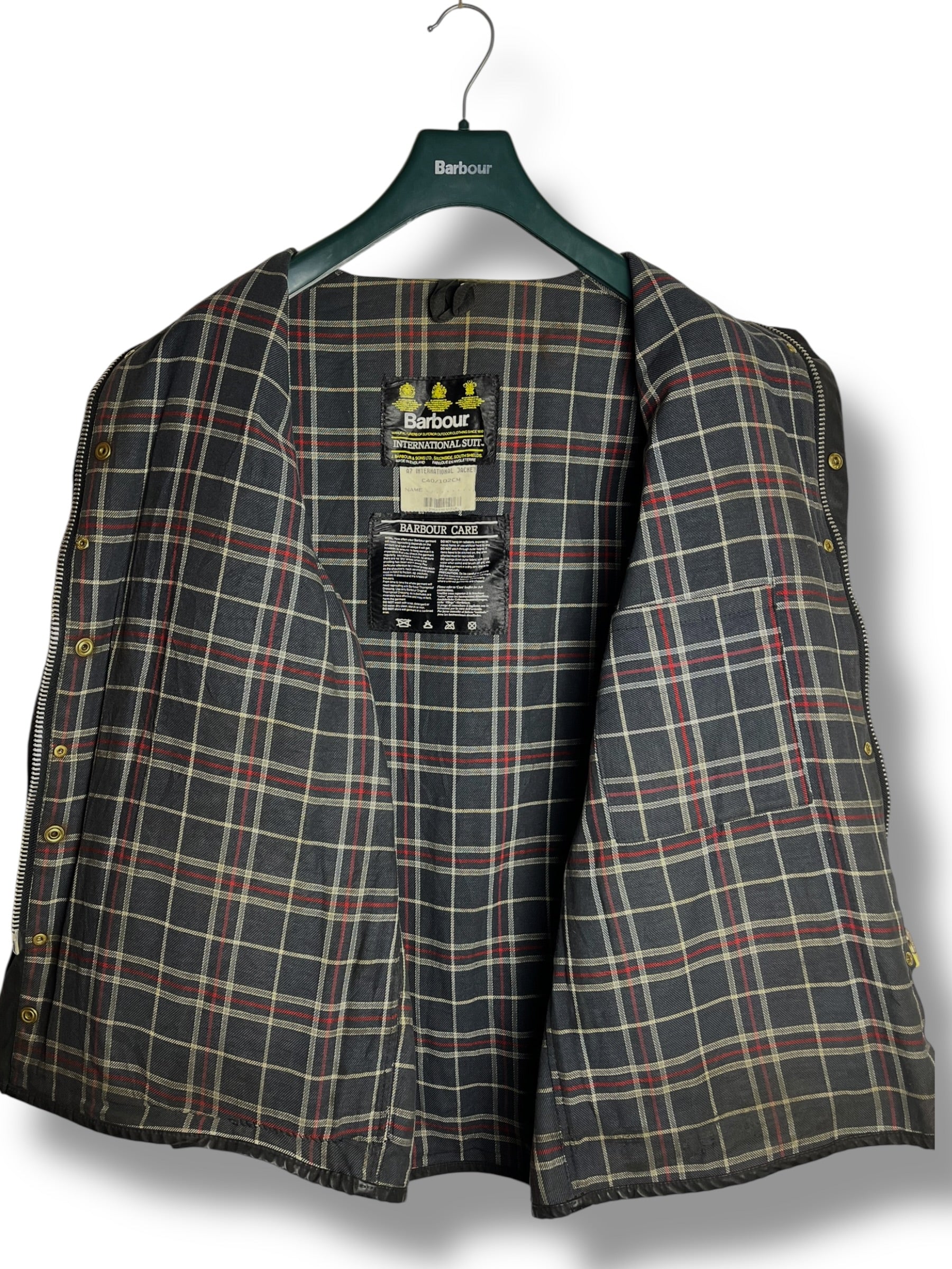 Original Barbour International A7 from 1992, made in England. Iconic motorcycle jacket in heavy waxed cotton, deep navy blue that appears almost black. Classic four front pockets, angled chest pocket with Barbour International patch, buckle throat latch collar and signature Barbour tartan lining.