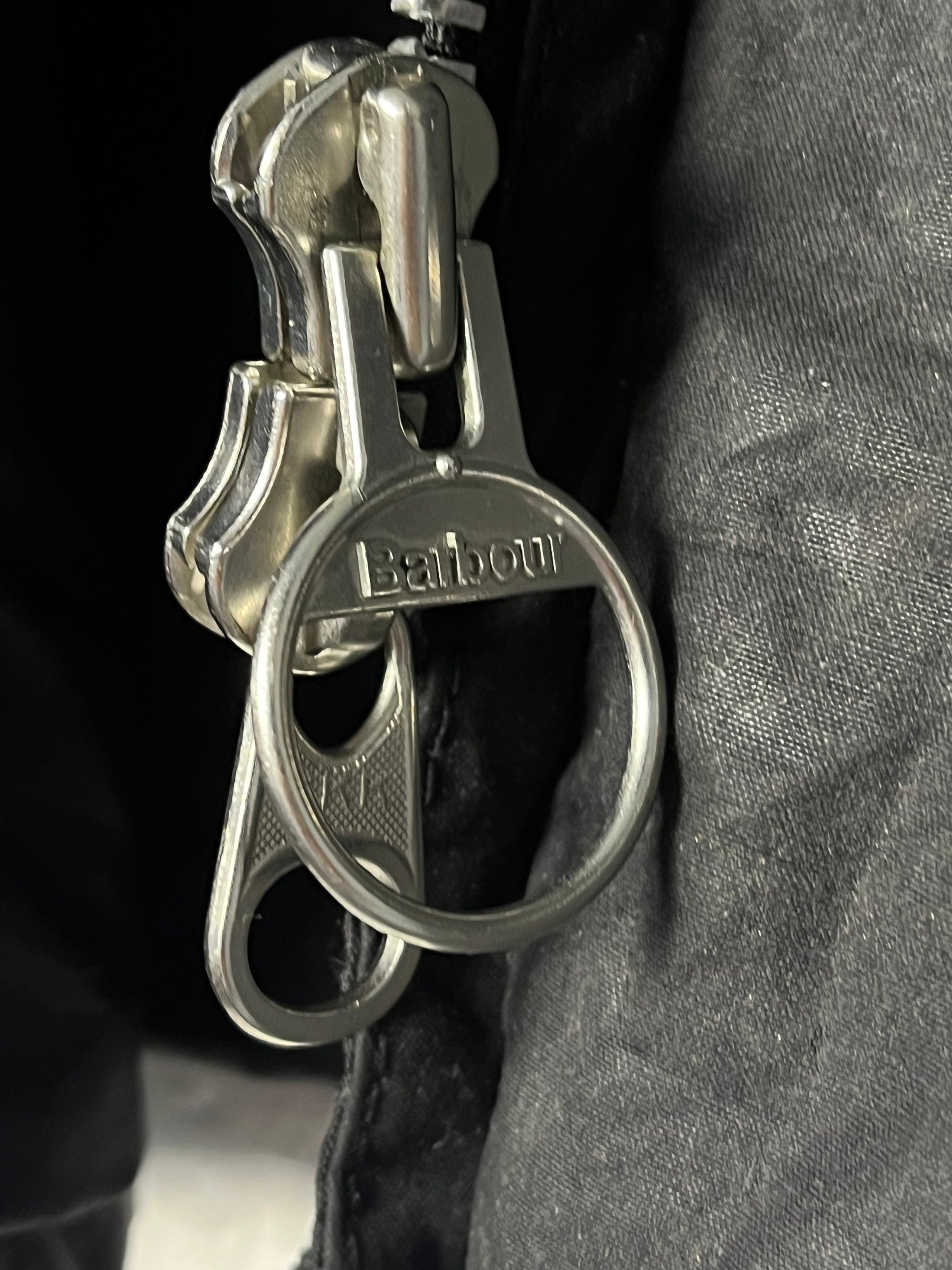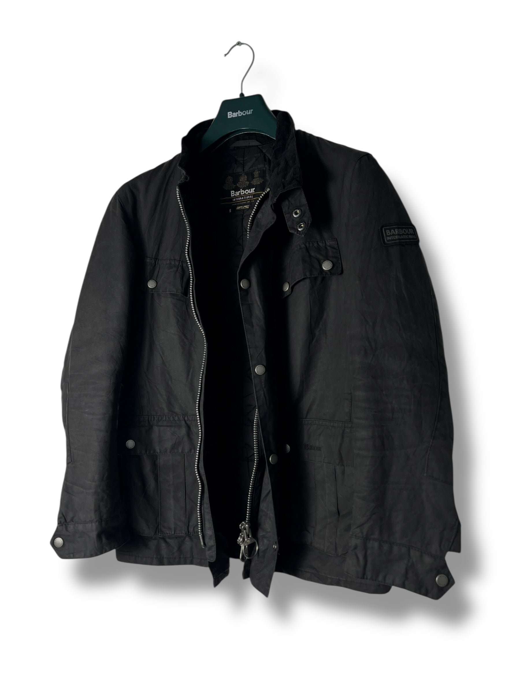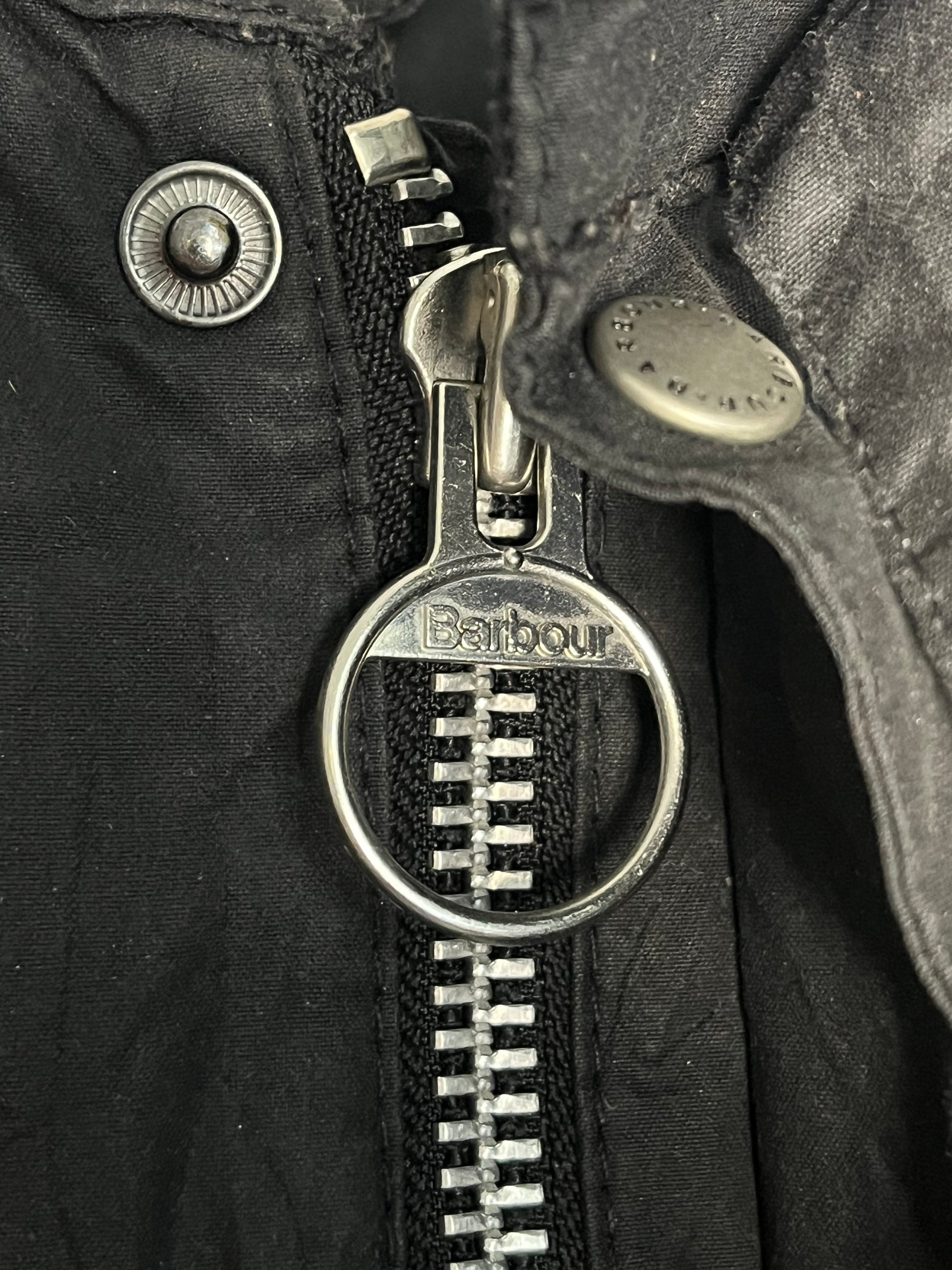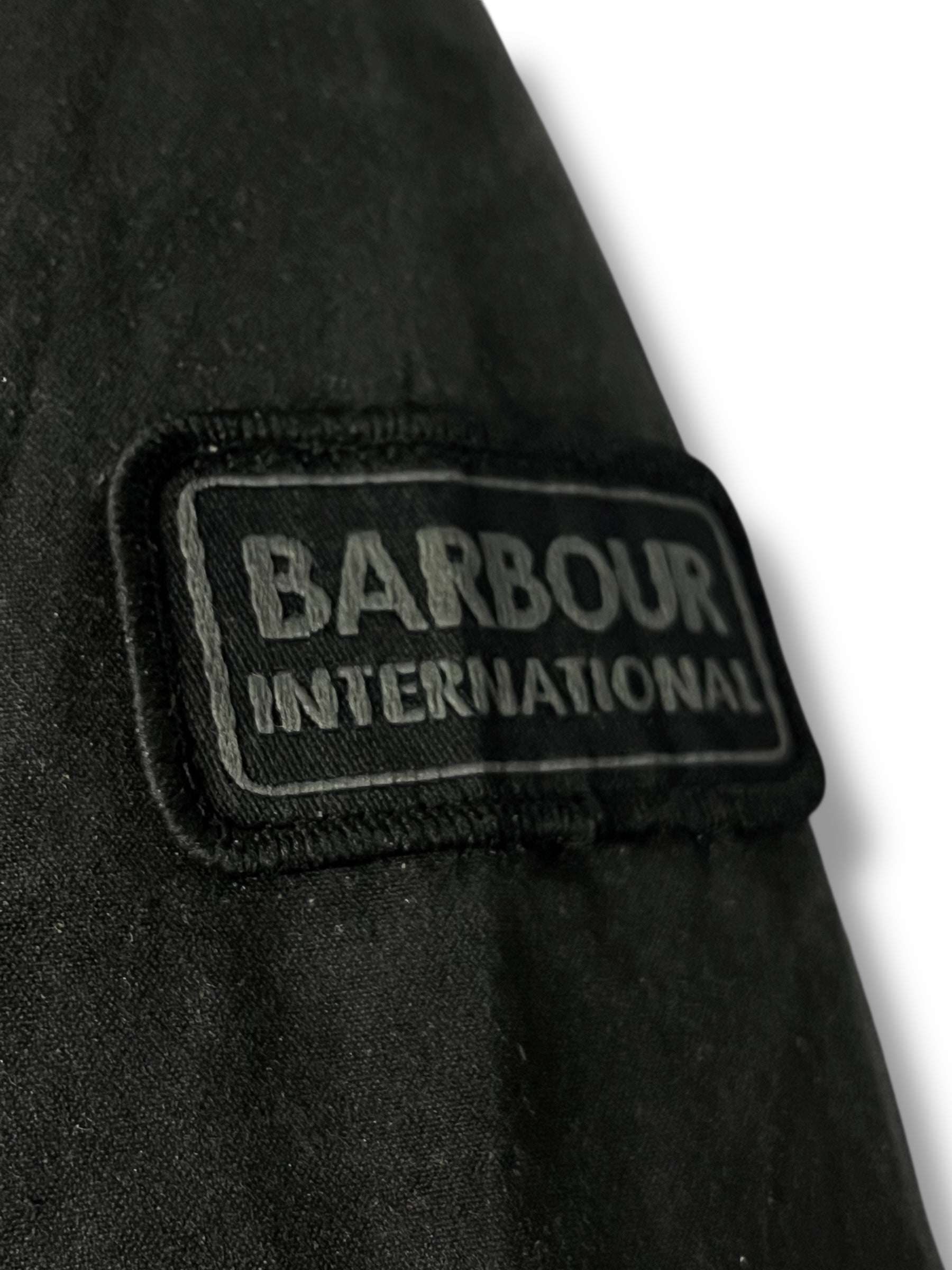 Silver YKK two-way zip, snap buttons, and Barbour International patch on the sleeve.