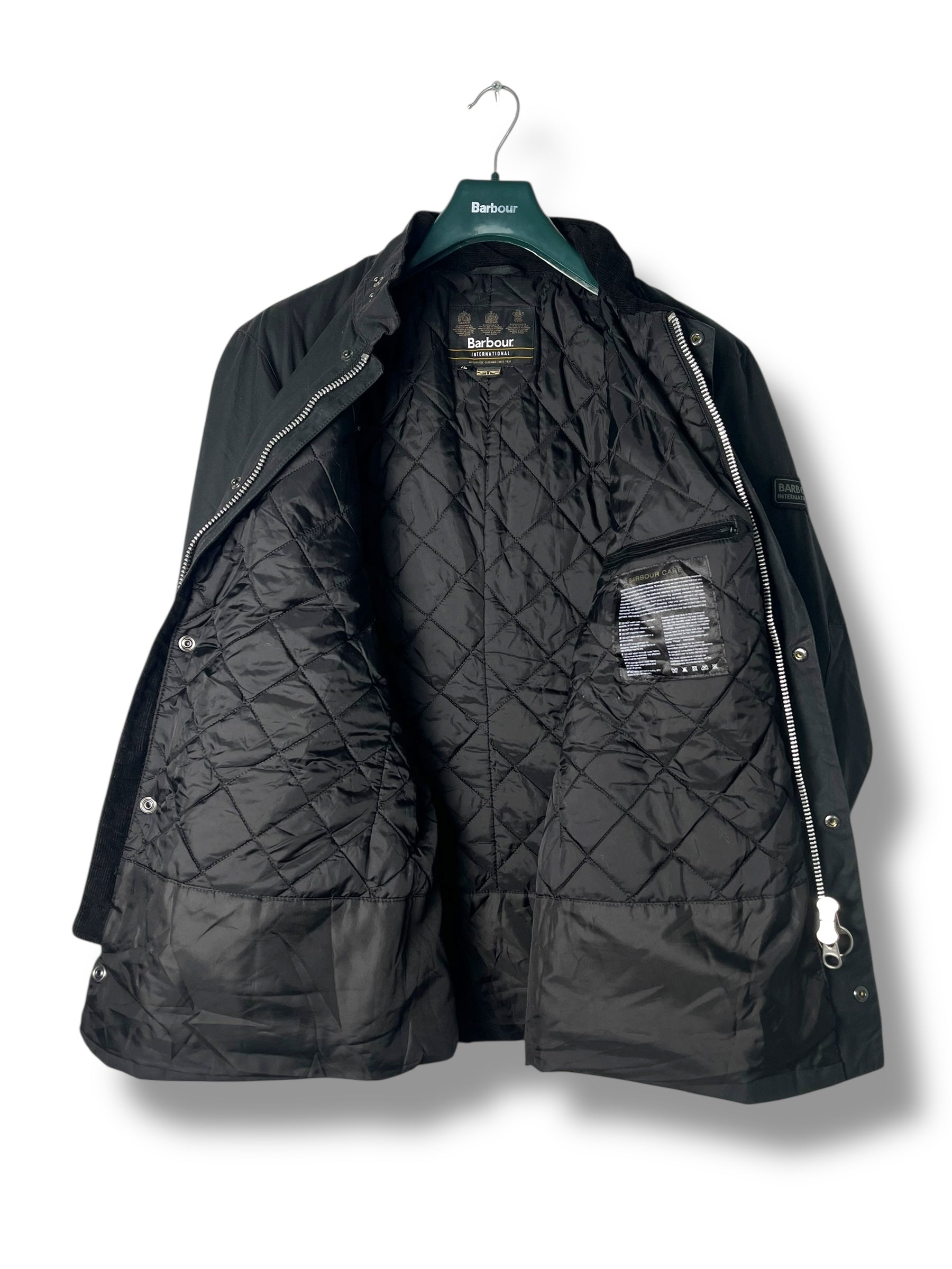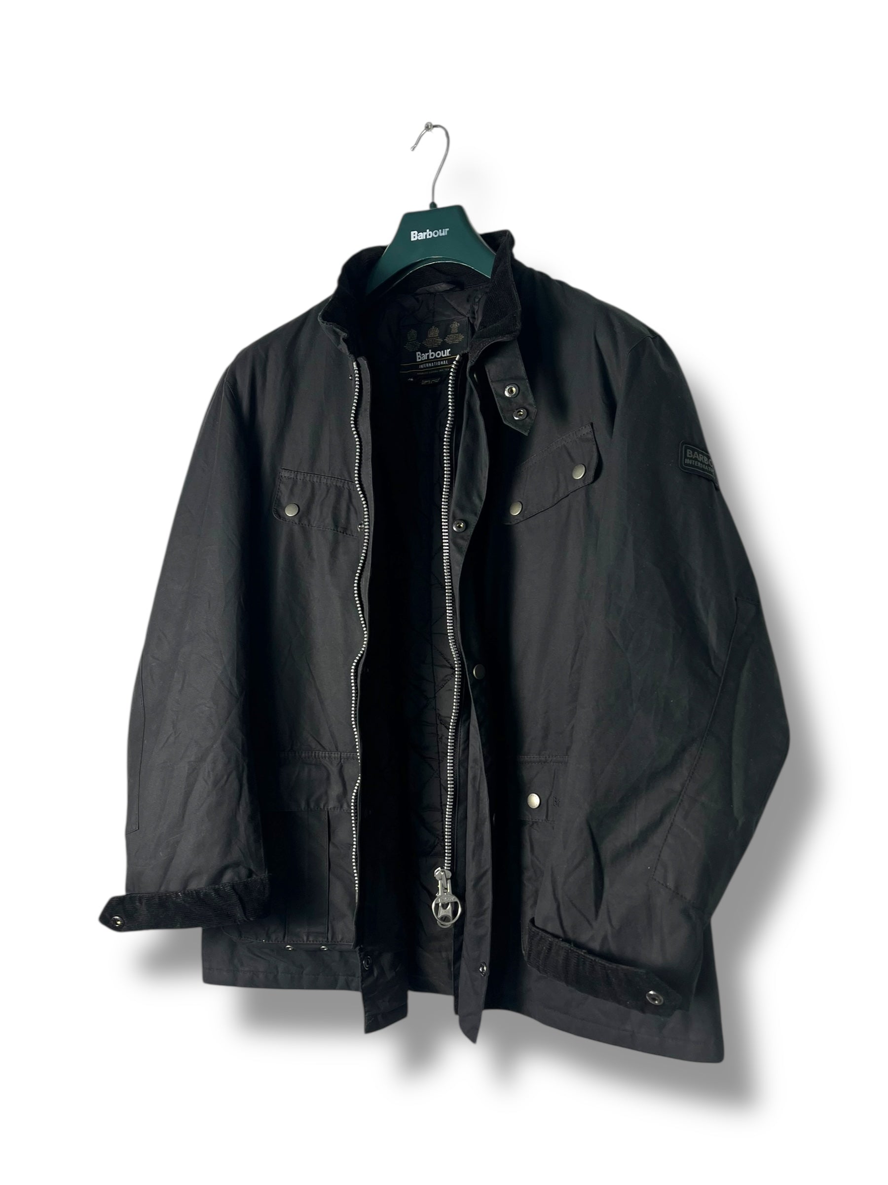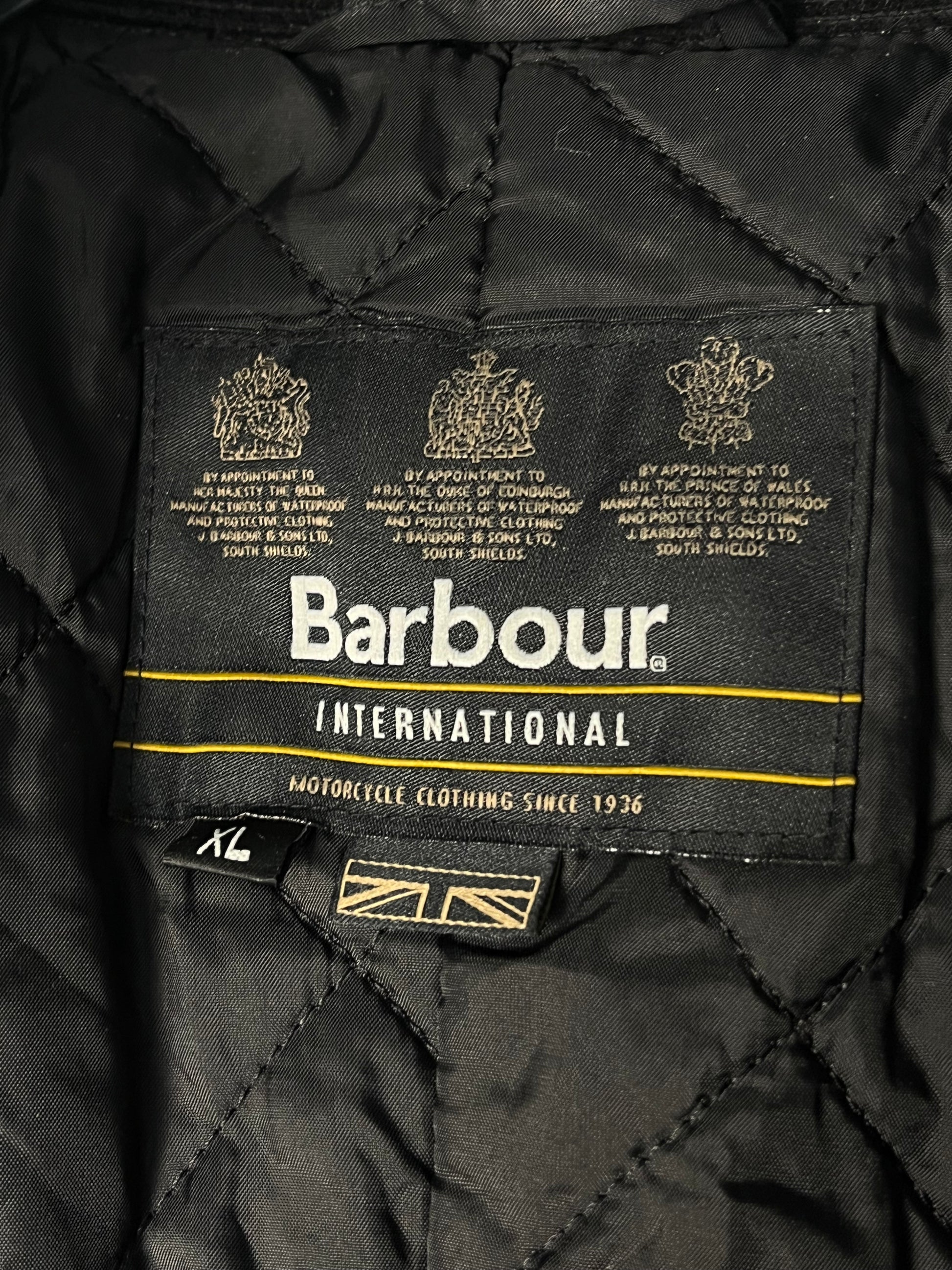 Keywords: Barbour International Duke, waxed jacket, black Barbour, motorcycle jacket, Barbour XL, made in England, heritage outerwear, vintage Barbour, biker jacket
