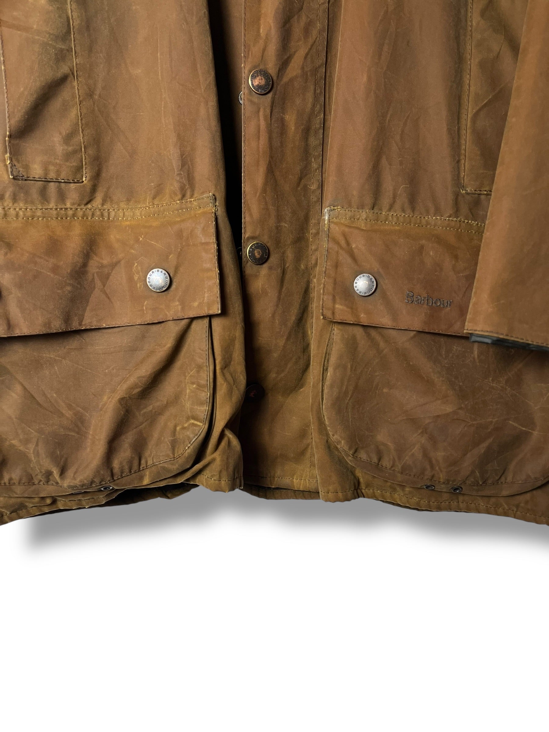 Iconic Barbour Moorland in classic sandstone colour. Heavyweight waxed cotton with authentic vintage patina. Recently washed and rewaxed, ready to wear. A true heritage Barbour featuring the signature rear game pocket.