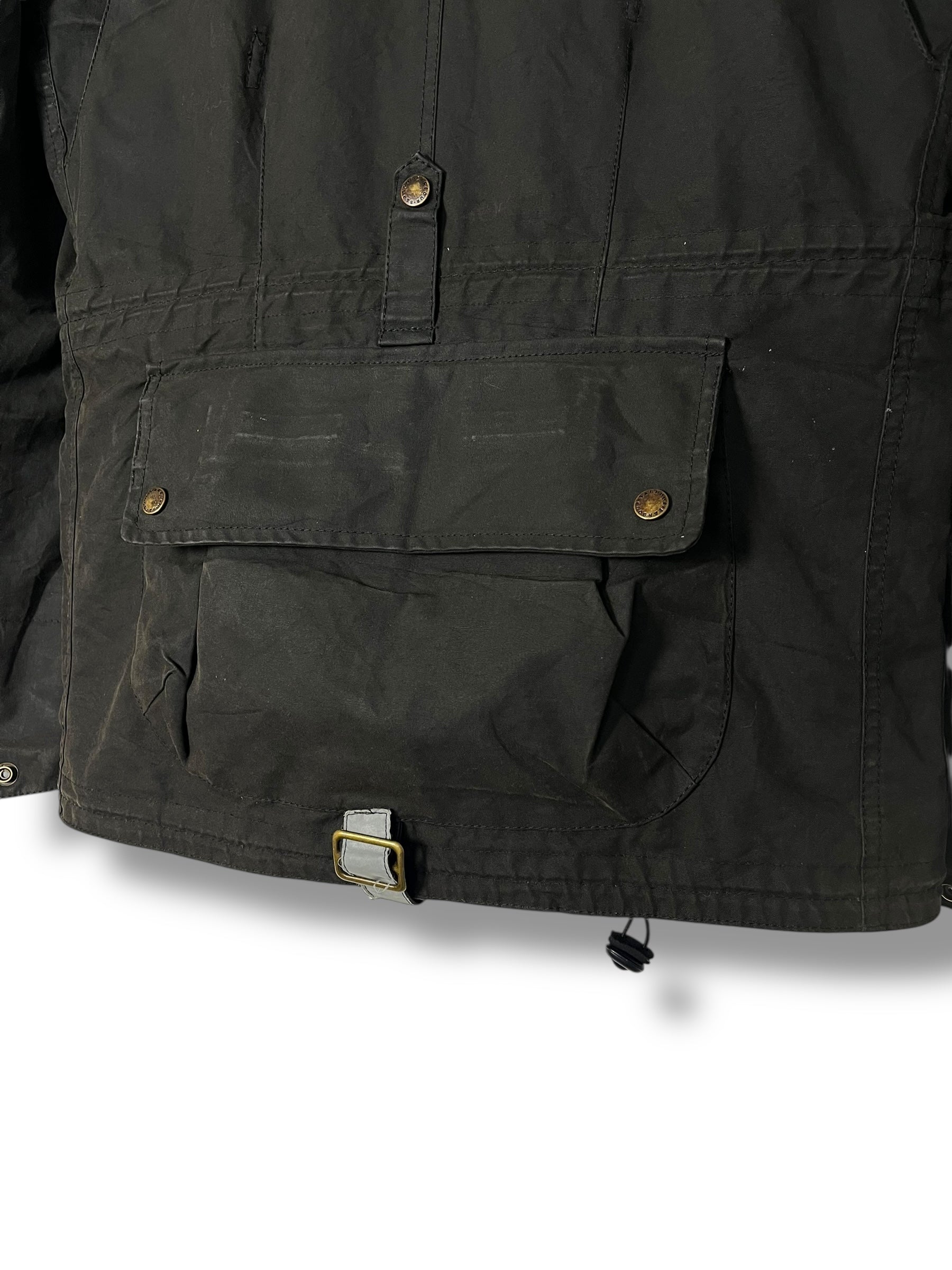 This model features multi-pocket front storage, a rear backpack-style pocket (a reinterpretation of the classic game pocket), adjustable waist with drawcord, and a throat-latch buckle closure. The five-button detail is on the cuffs, adding that unmistakable Barbour utility look.