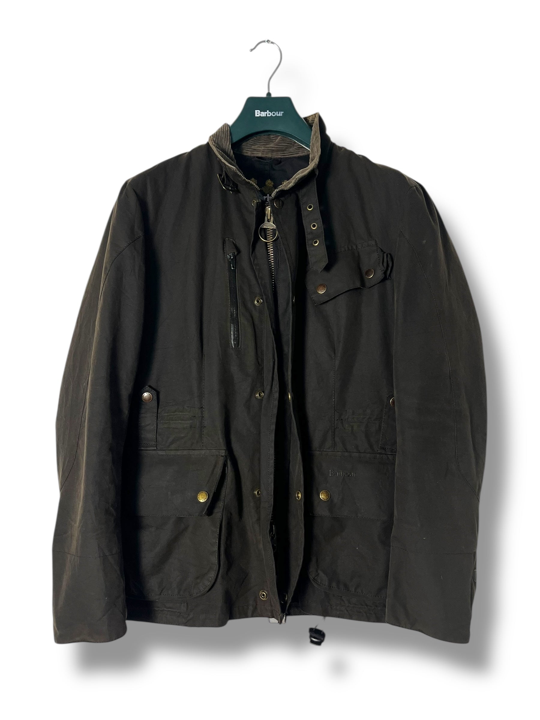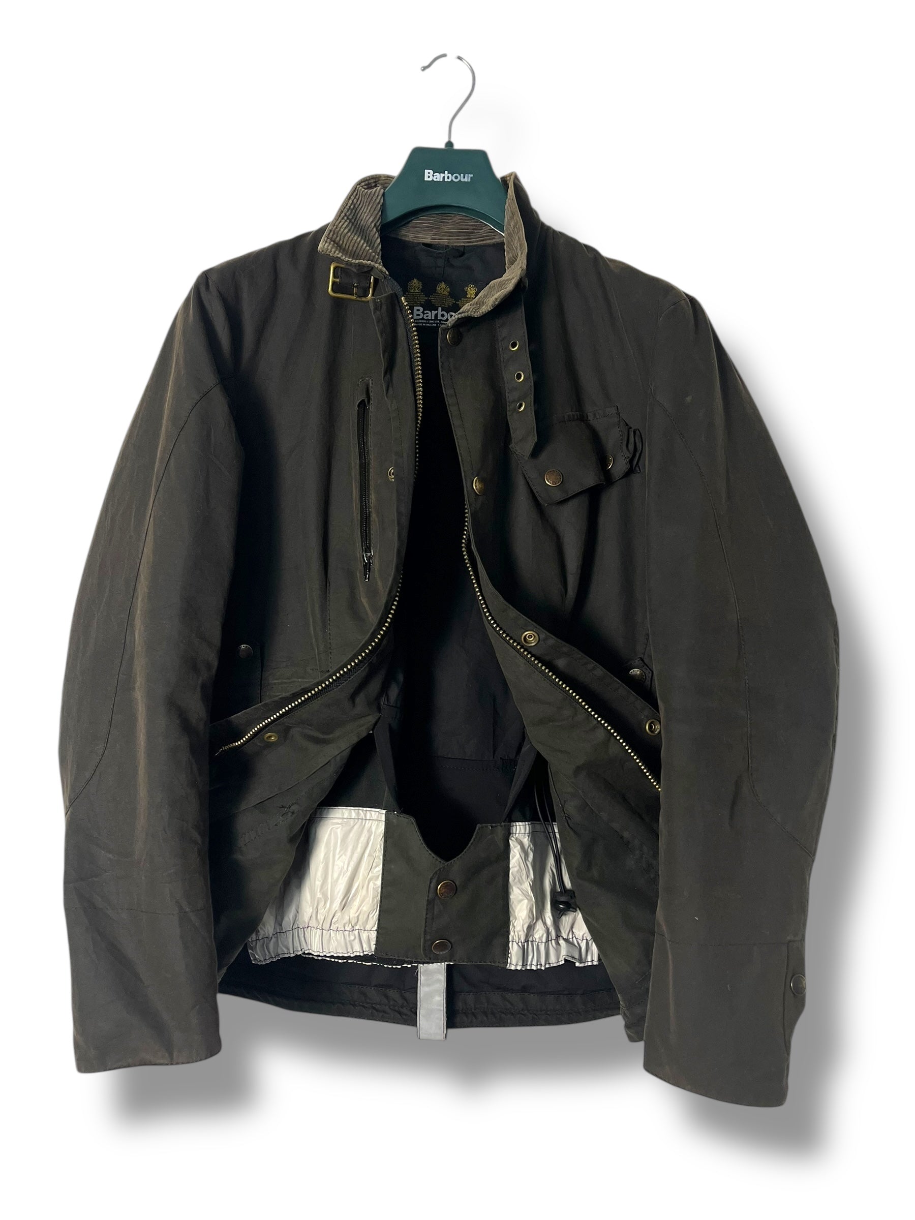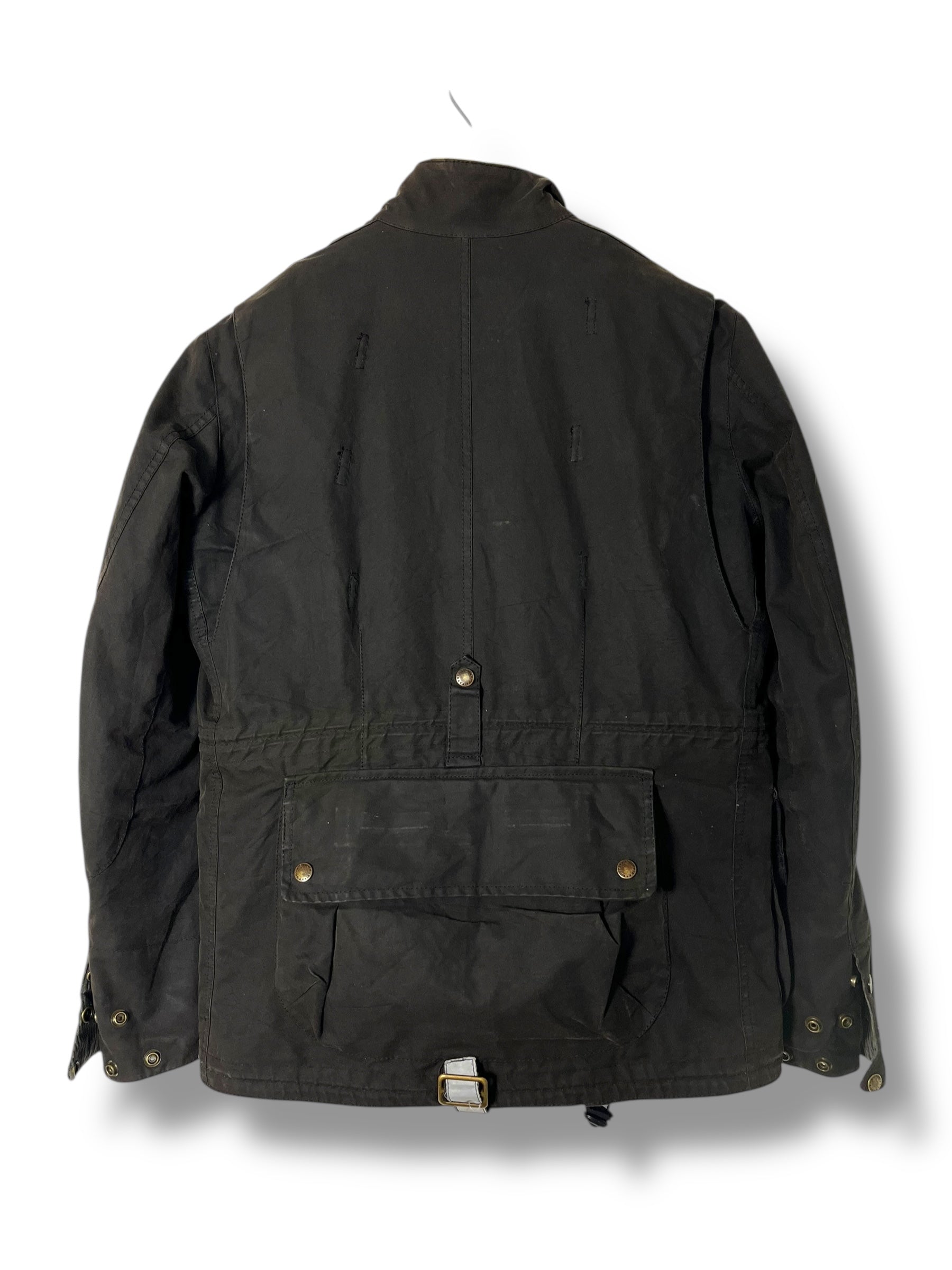 Keywords: Barbour New International, waxed motorcycle jacket, black wax jacket, early 2000s Barbour, vintage Barbour, technical waxed cotton.