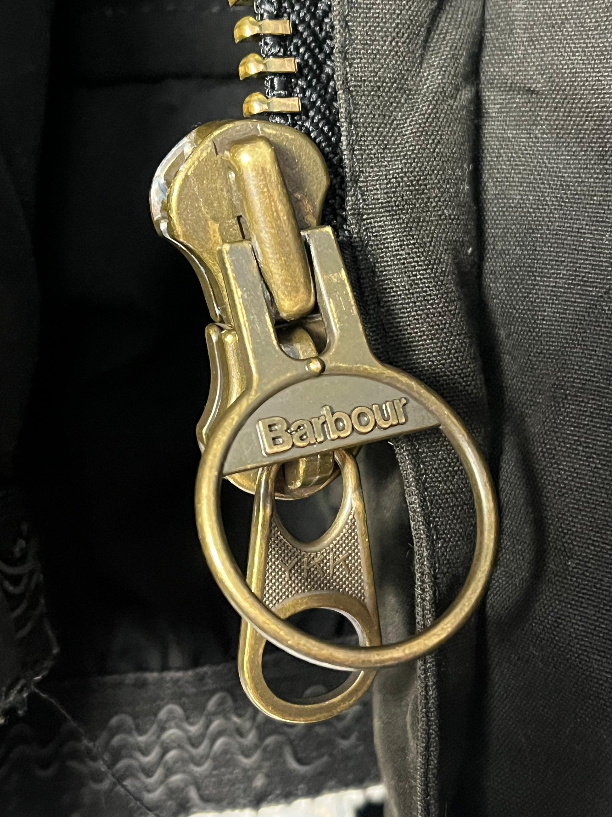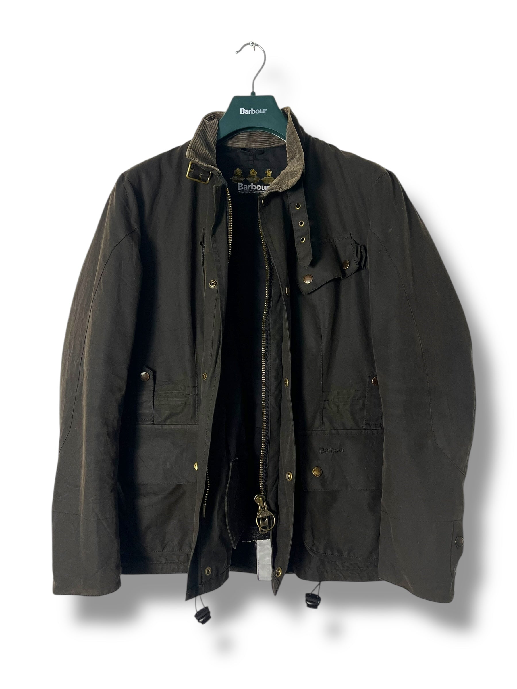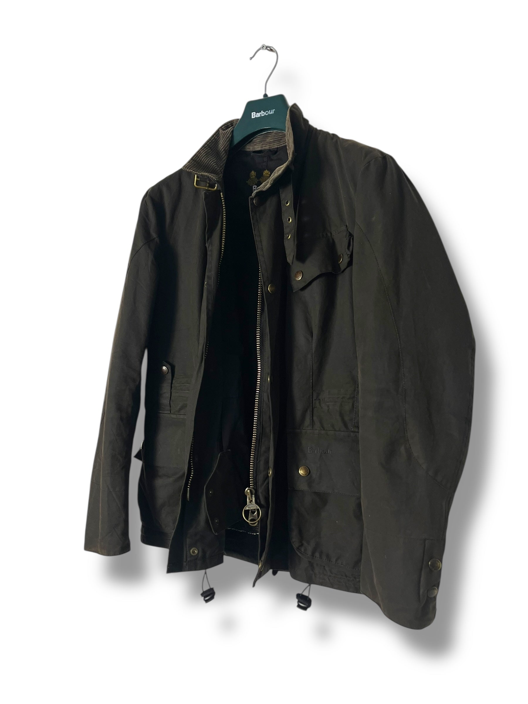 Keywords: Barbour New International, waxed motorcycle jacket, black wax jacket, early 2000s Barbour, vintage Barbour, technical waxed cotton.