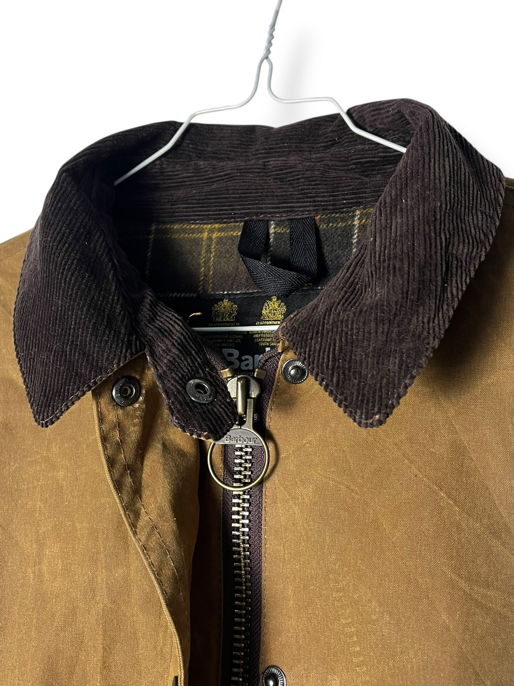 The colour is a rare vintage Sandstone — warm, earthy, and naturally faded in a way only true Barbour waxed cotton can achieve.