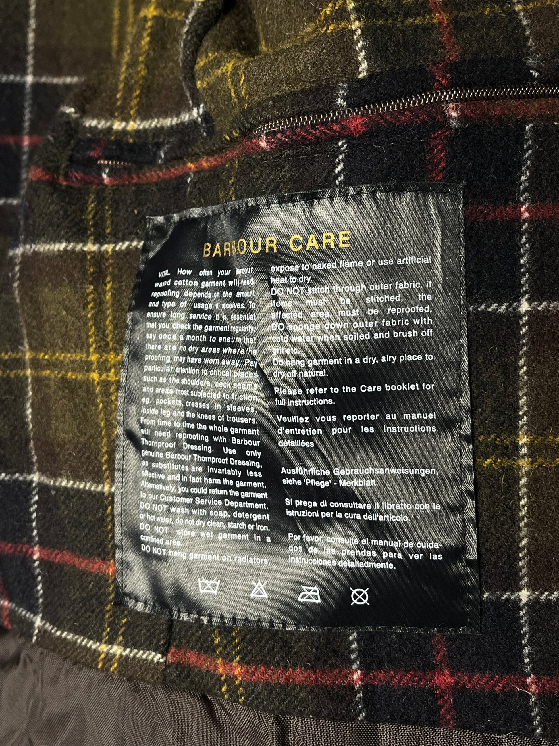 Beautiful early-2000s Barbour Newmarket in sandstone 100% waxed cotton, featuring a warm wool-lined upper interior and a long, protective cut ideal for winter. The corduroy-lined collar can be closed fully to shield the neck, and the cuffs feature additional corduroy facing for comfort and insulation.