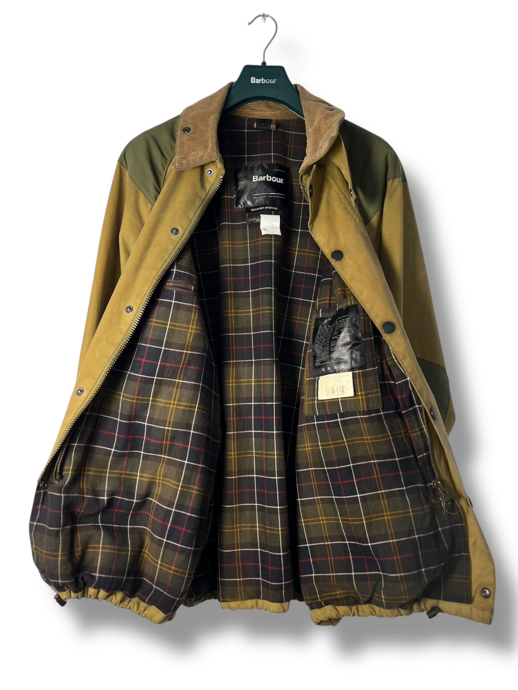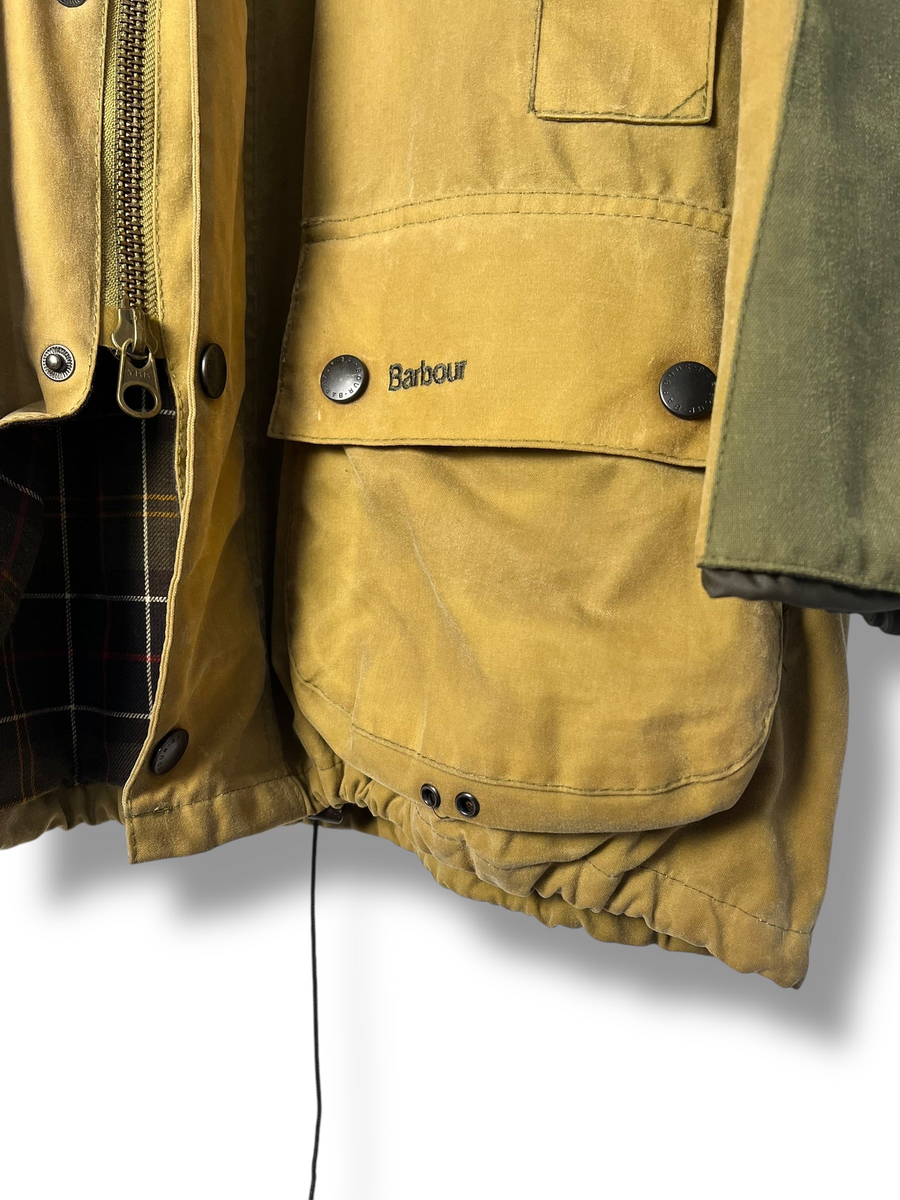 Keywords: Barbour Sporting, Barbour wax jacket, mustard Barbour jacket, C48 Barbour, Barbour XL fit, waxed cotton jacket, Barbour tartan lining, vintage Barbour, Selected by DRAPS