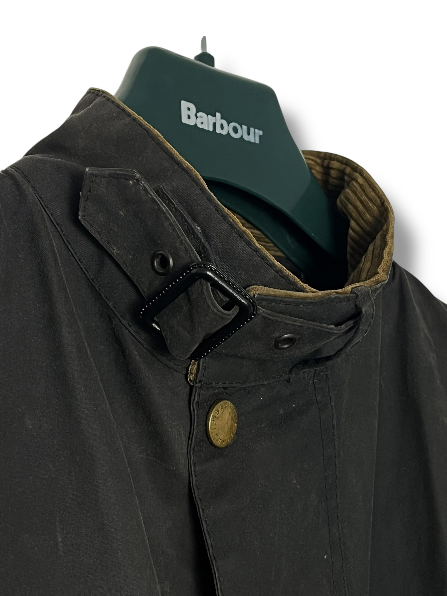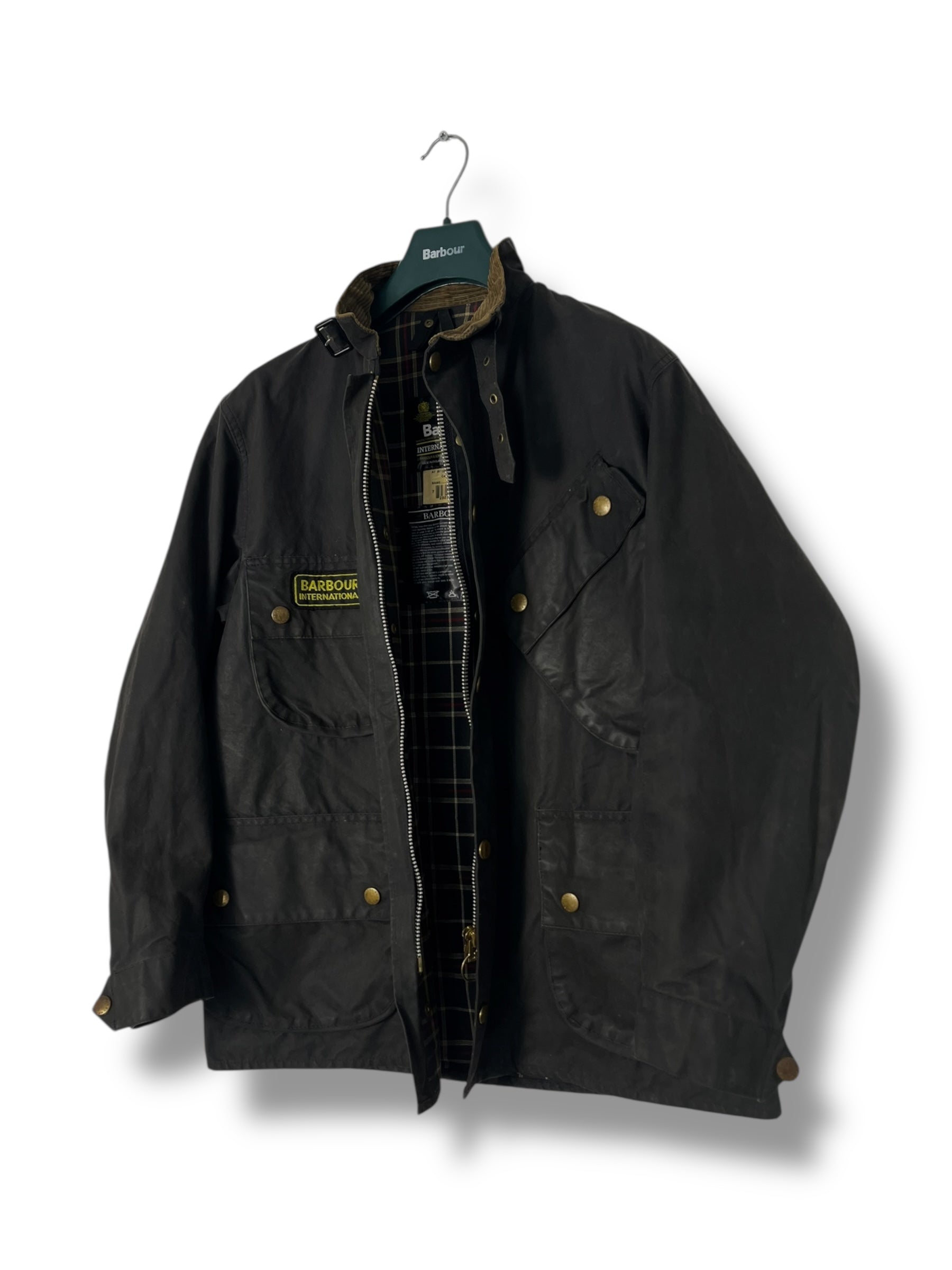 This is a rare original International Suit A7, one of Barbour’s most iconic 90s jackets — military-inspired, rugged, and built with the classic trooper layout. Features the signature angled chest pocket, four large front pockets, corduroy collar, throat latch, adjustable cuffs and traditional tartan lining. Originally designed with a belt (not included on this piece).